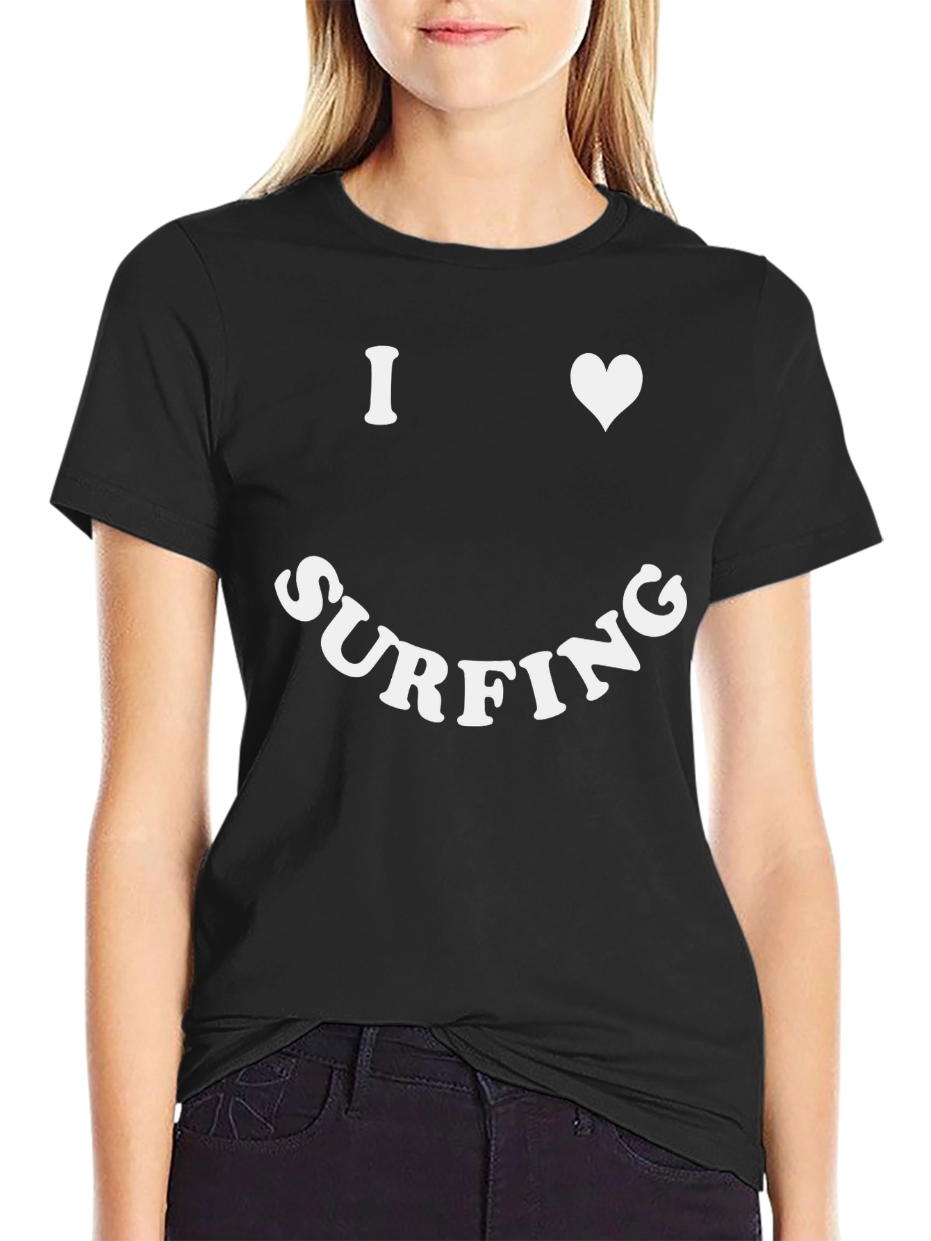 Showcase your passion for the waves with this stylish black graphic tee. The shirt features a bold 'I [Heart] SURFING' design, with the word 'SURFING' creatively arched to mimic a smile. Made from a comfortable material, this tee is perfect for casual wear, beach outings, or surf trips. Express your love for surfing with this eye-catching and comfortable tee. Great gift for surfing lovers!