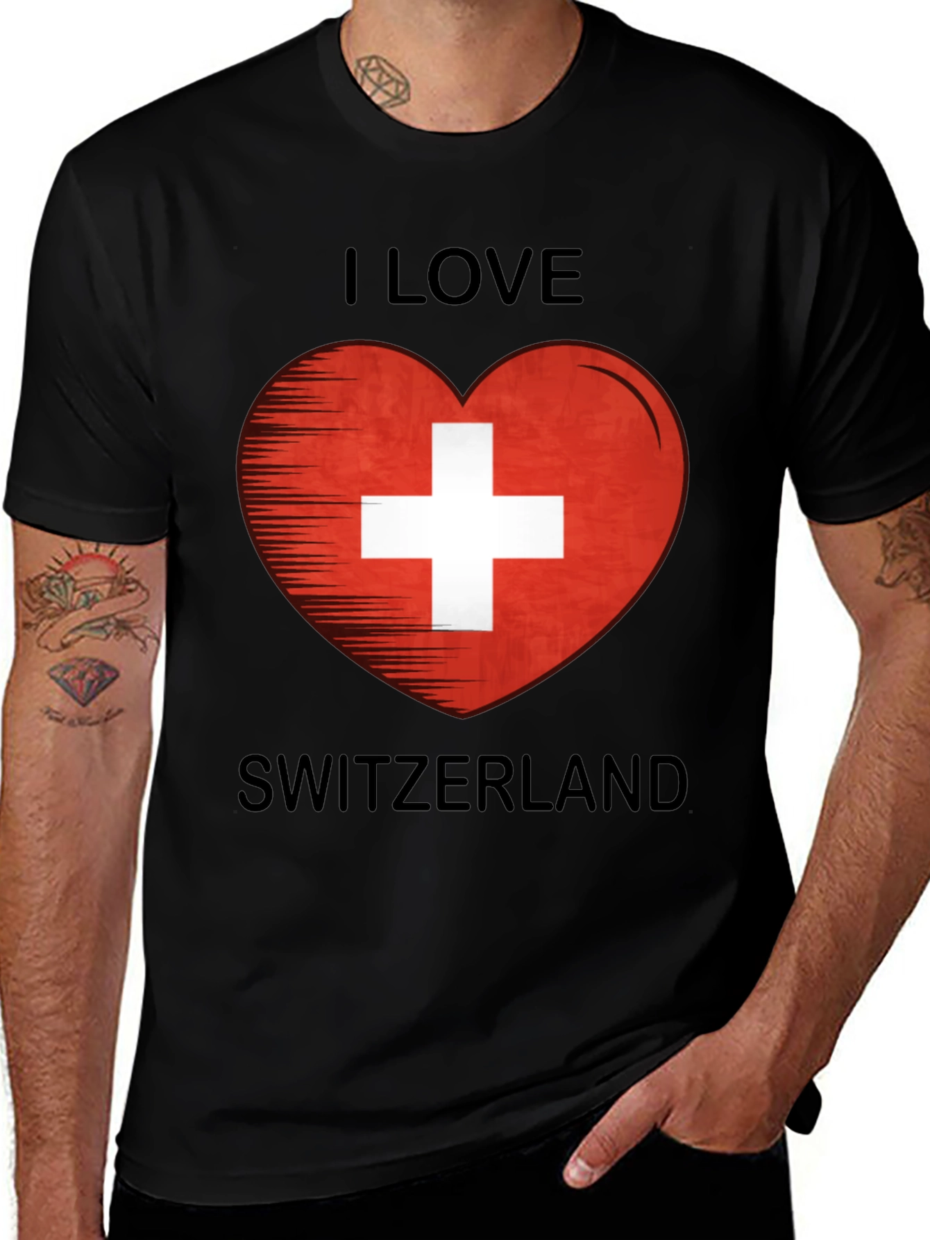 Show your love for Switzerland with this stylish graphic t-shirt. The design features a heart filled with the Swiss flag's red and white cross emblem, accompanied by 'I LOVE SWITZERLAND' text. Made from a comfortable, dark-colored fabric, this tee is perfect for casual wear, travel, or as a souvenir. The heart graphic features a distressed look that adds character. Stand out with this unique, patriotic statement piece!