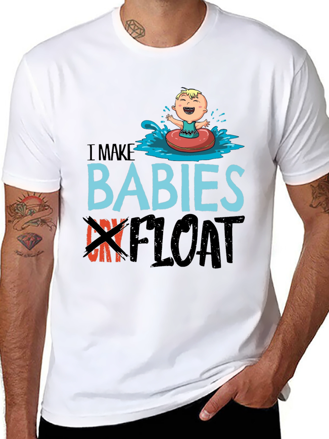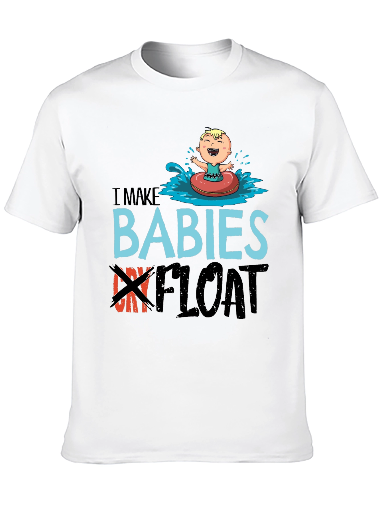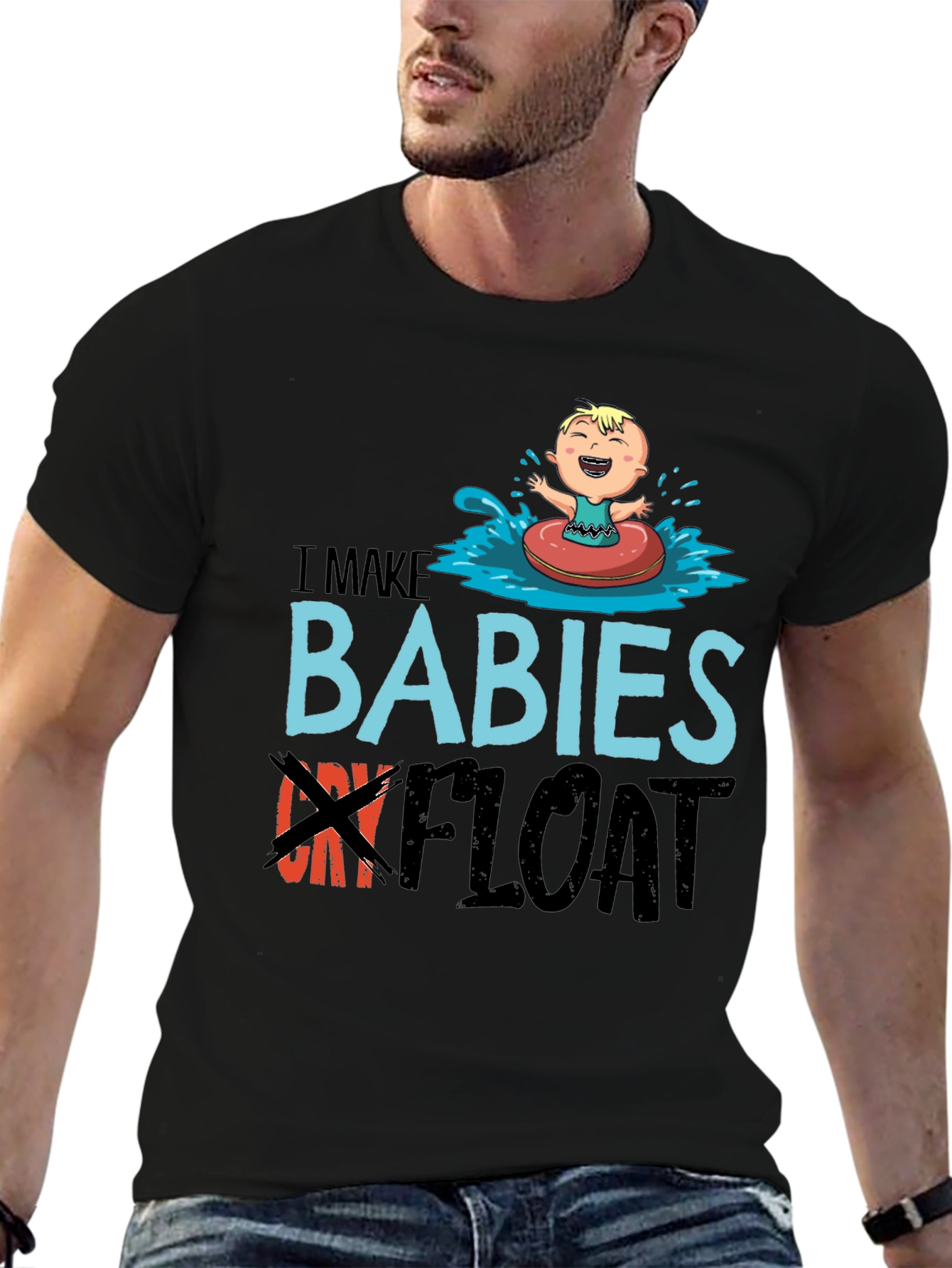 This black t-shirt features a humorous graphic that will surely get a laugh. The design includes a cartoon baby happily floating in an inner tube, accompanied by the phrase 'I MAKE BABIES FLOAT' with 'cry' crossed out. It's a playful take on the phrase and is perfect for anyone who enjoys funny and lighthearted apparel. The print is eye-catching, featuring light blue for the word 'Babies', while the rest is in darker shades. Made from comfortable, breathable fabric, this tee is ideal for casual wear, pool parties, or just lounging around. Express your fun side with this unique shirt!