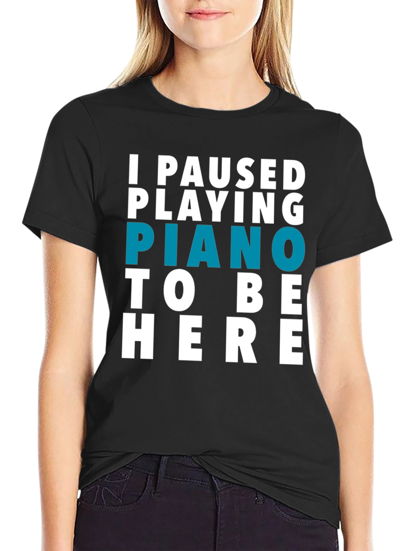 This stylish black t-shirt is perfect for piano players with a sense of humor. The bold white text states "I PAUSED PLAYING PIANO TO BE HERE," with "PIANO" highlighted in a bright teal color. Made from a comfortable-looking fabric, this tee is ideal for casual wear, music recitals, or lounging around the house. Show off your love for music and your playful personality with this eye-catching shirt. Makes a great gift for pianists, music students, or anyone who appreciates a good pun. Wear it to concerts, lessons, or just out and about to spark conversation and laughter.