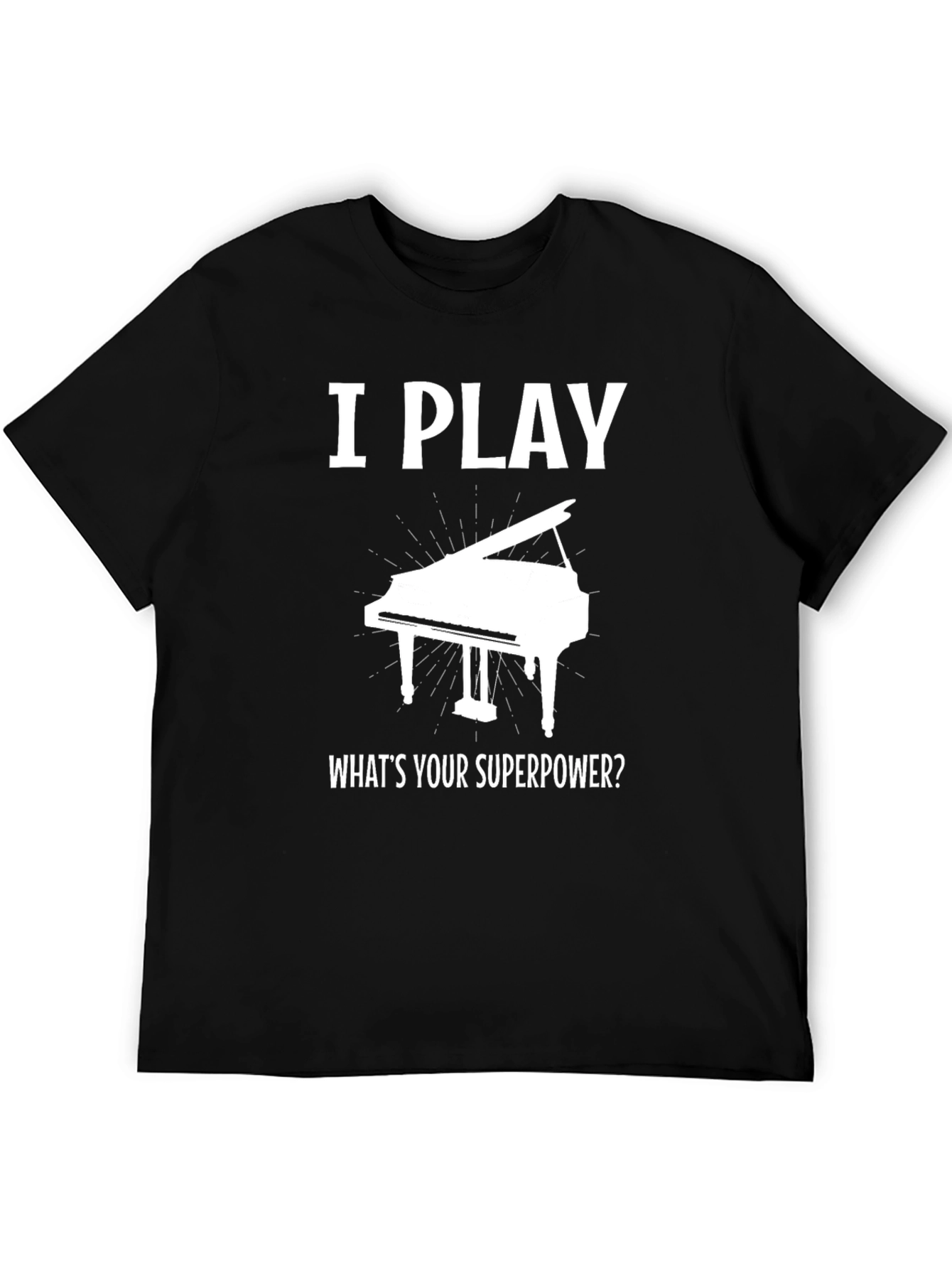 Show off your musical talent with this fun "I PLAY PIANO WHAT'S YOUR SUPERPOWER?" t-shirt. This eye-catching tee features a crisp white piano graphic contrasted against a classic black background. It's a perfect conversation starter and a great way to express your passion for music. Made from a soft, comfortable fabric, this shirt is ideal for casual wear, music recitals, or band practice. Let the world know about your amazing superpower with this unique piano player t-shirt! Available in various sizes.