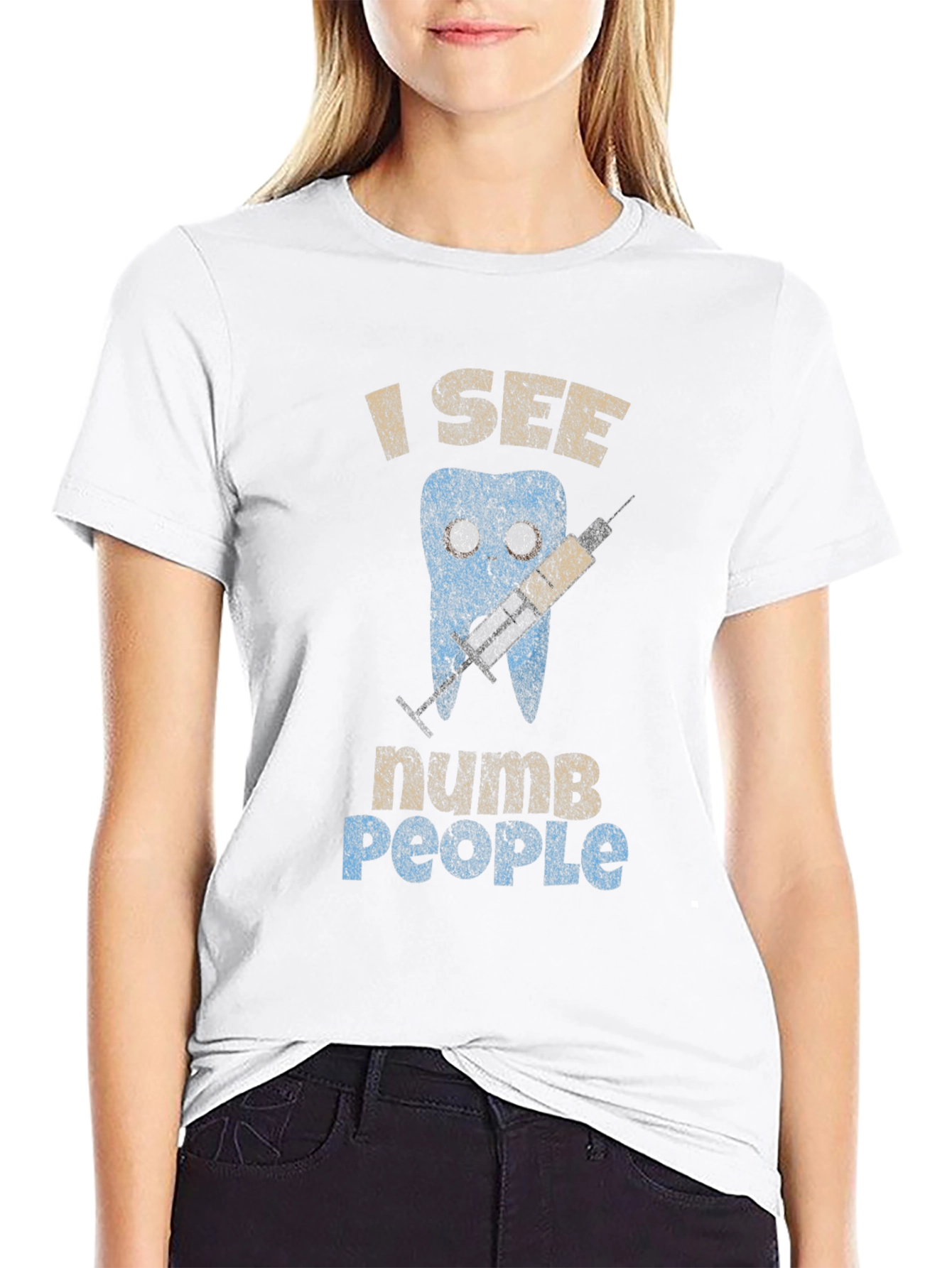 Show off your love for dentistry with this unique and eye-catching graphic tee! This black t-shirt features a distressed-style graphic that humorously states "I SEE NUMB PEOPLE," accompanied by an illustration of a tooth with a syringe. The design has a cool, vintage feel with its faded text and imagery. Made from what appears to be a soft and breathable fabric, this shirt offers both style and comfort. Perfect for dentists, dental students, or anyone with a fun sense of humor. It is suitable for casual wear and can be a great conversation starter.