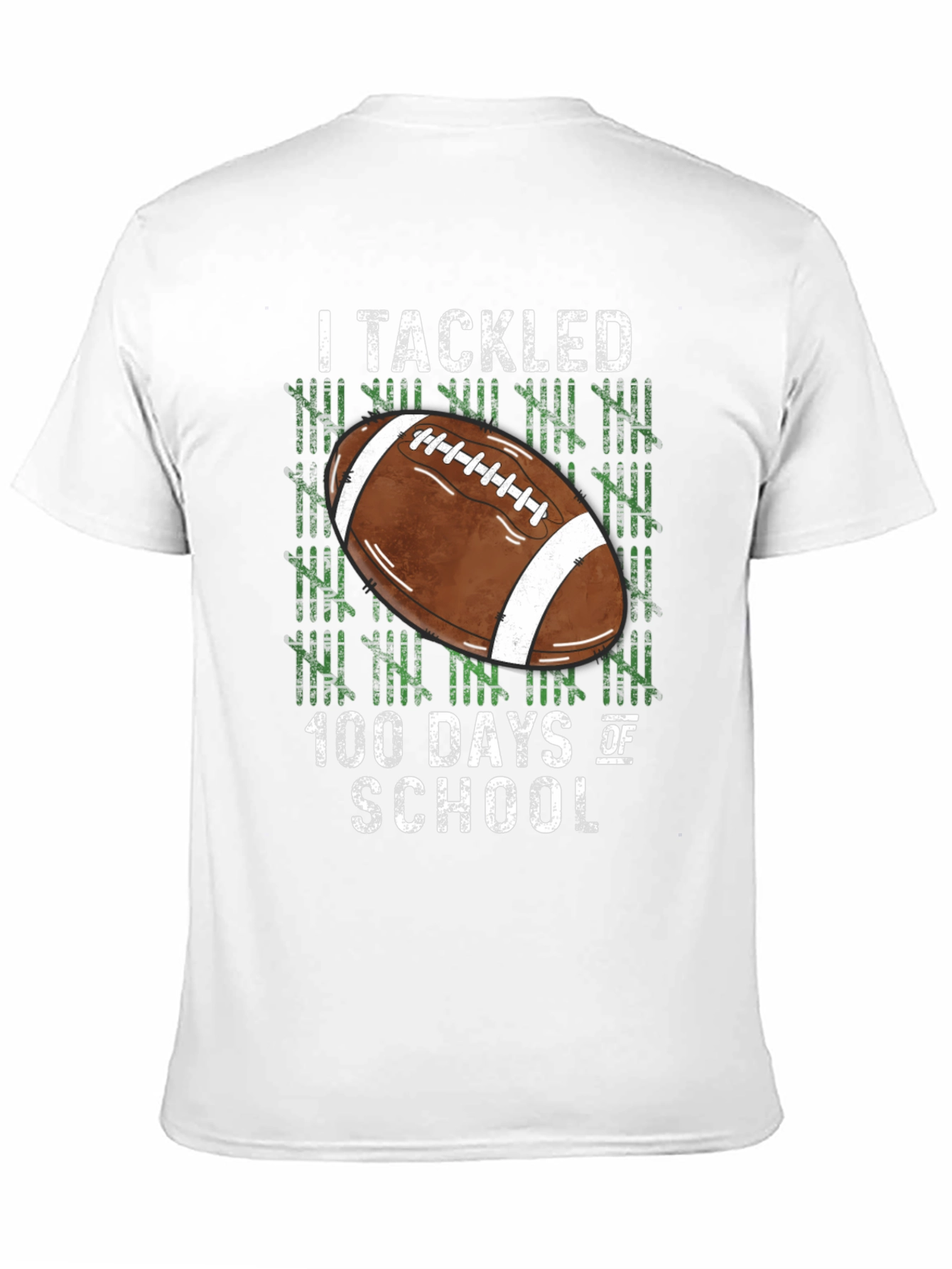 Show off your student's accomplishment with this fun "I Tackled 100 Days of School" t-shirt. Featuring a bold football graphic and playful tally mark design, this shirt celebrates a milestone in a unique way. The black tee provides a stylish backdrop for the vibrant white and brown print. Made from comfortable material, it's perfect for wearing to school, parties, or just casual everyday wear. Let your child proudly display their academic achievement with this memorable shirt.