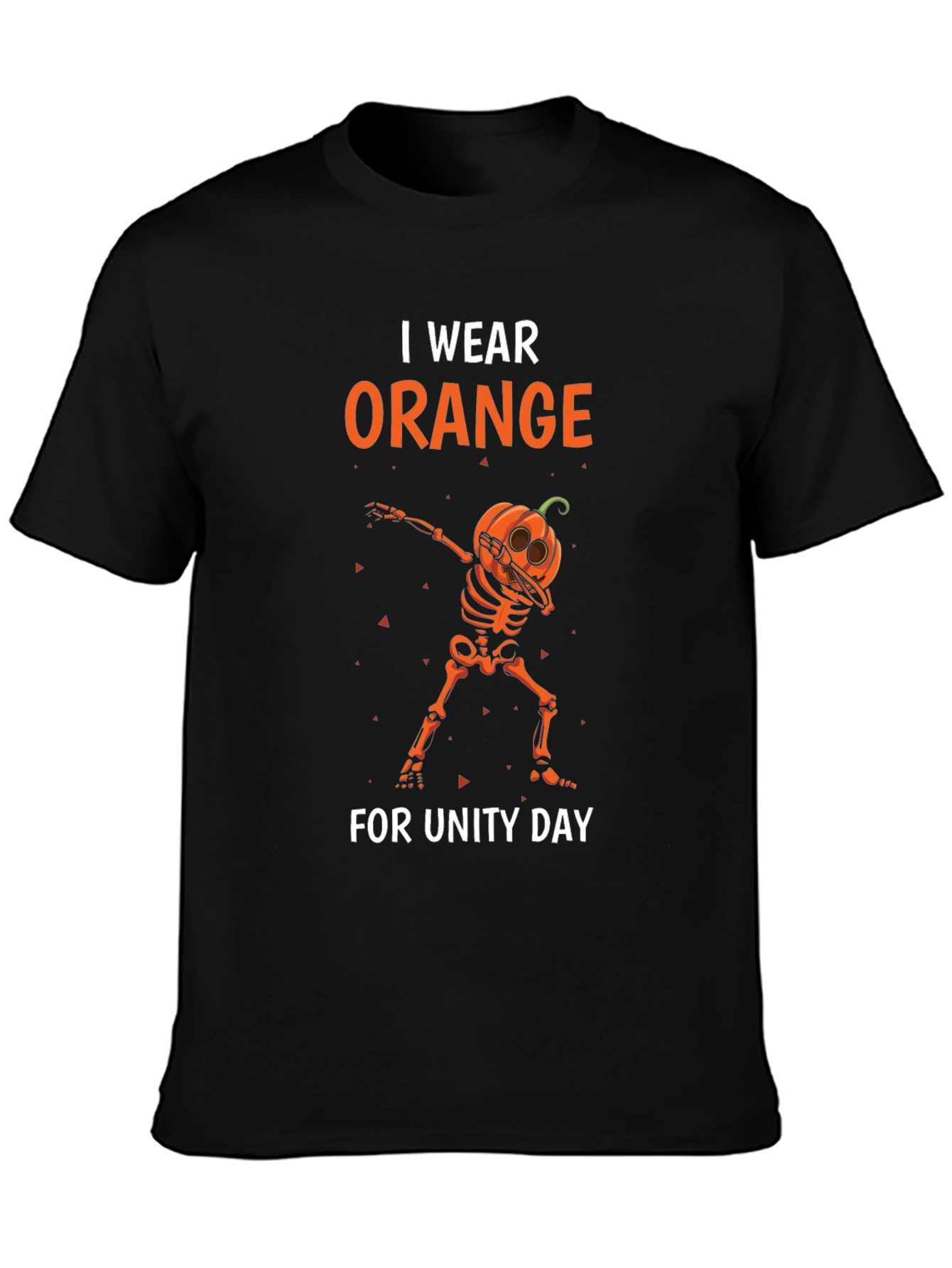 Show your support for Unity Day with this unique black t-shirt. The design features a skeleton with a pumpkin head dabbing. The words "I WEAR ORANGE FOR UNITY DAY" are printed above and below the graphic in bold letters. Made from a comfortable-looking fabric, this tee is perfect for raising awareness. Wear it proudly to show your commitment to kindness, acceptance, and inclusion. Makes a thoughtful gift for family, friends, and colleagues.