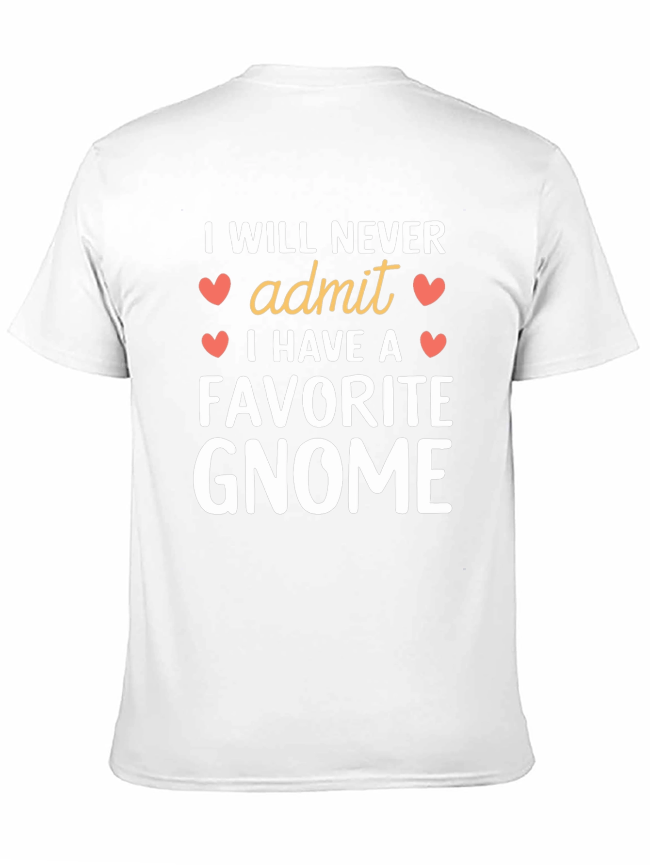 Show off your love for gnomes with this stylish black t-shirt! Featuring a fun and whimsical design, this shirt declares "I Will Never Admit I Have A Favorite Gnome" in bold white lettering, accented with cute coral heart details. The word "admit" is a contrasting gold color to add a touch of flair. Made from a comfortable and breathable fabric, this t-shirt is perfect for everyday wear. Ideal for casual outings, garden parties, or simply lounging around the house. Makes a great gift for gnome enthusiasts and anyone with a playful sense of humor.