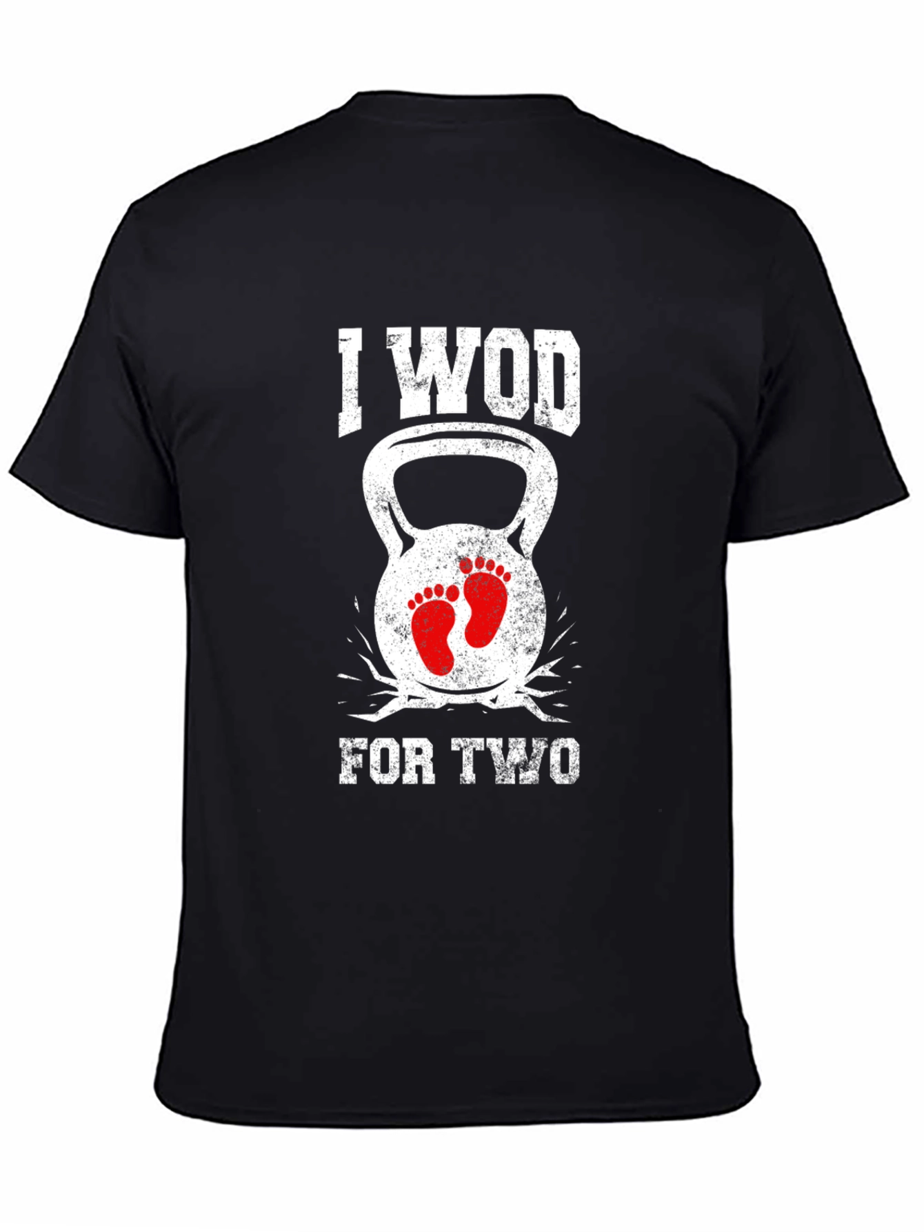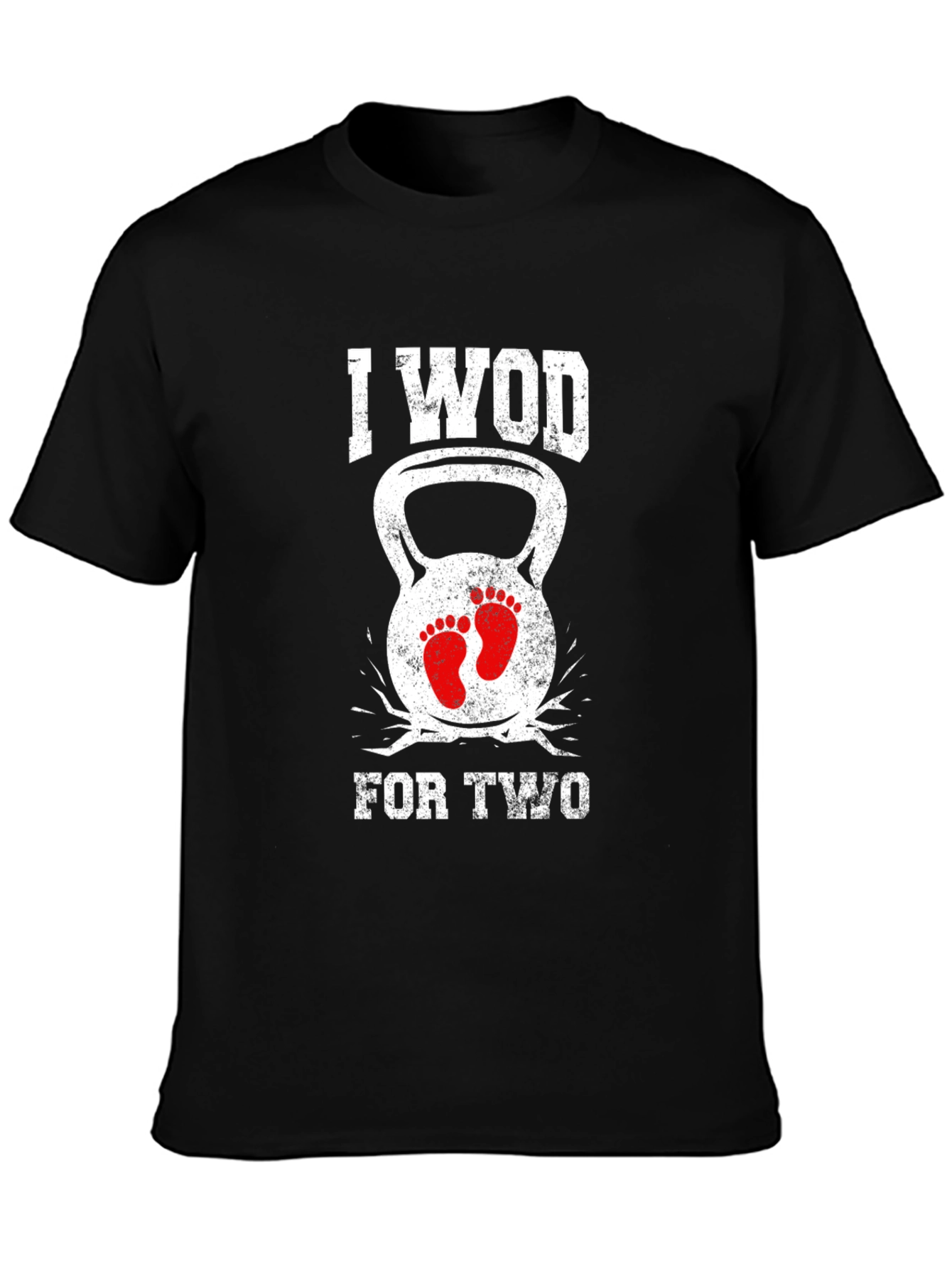 Show off your excitement for your growing family with this unique "I WOD For Two" t-shirt. The shirt features a crisp, white design with a kettlebell graphic, complete with red baby footprints inside. The distressed style gives it a vintage feel. Made from a soft, comfortable material, this tee is perfect for expectant parents who love fitness. Wear it to your next workout or casual outing to share your happy news in a fun and memorable way. It's the perfect gift to yourself or the fitness-loving parents-to-be in your life!
