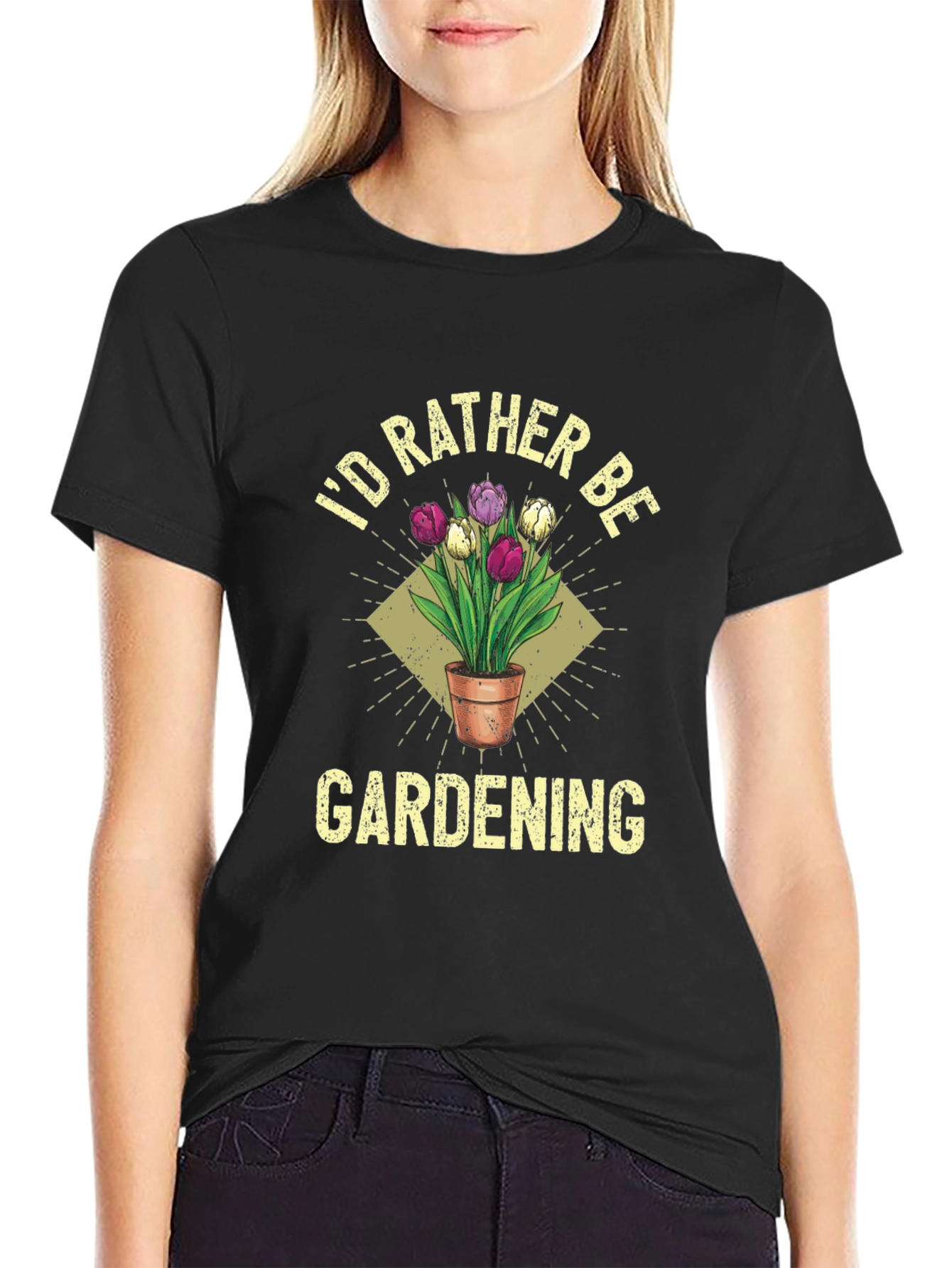 Show off your love for gardening with this stylish and comfortable t-shirt. This black tee features a vibrant graphic of tulips in a pot, surrounded by the phrase "I'd Rather Be Gardening" in a vintage-inspired font. Perfect for casual wear, gardening enthusiasts, or anyone who appreciates unique and eye-catching designs. Made from soft, breathable fabric, this t-shirt is ideal for everyday wear, whether you're tending to your garden, running errands, or just relaxing at home. A great gift idea for the green thumb in your life!