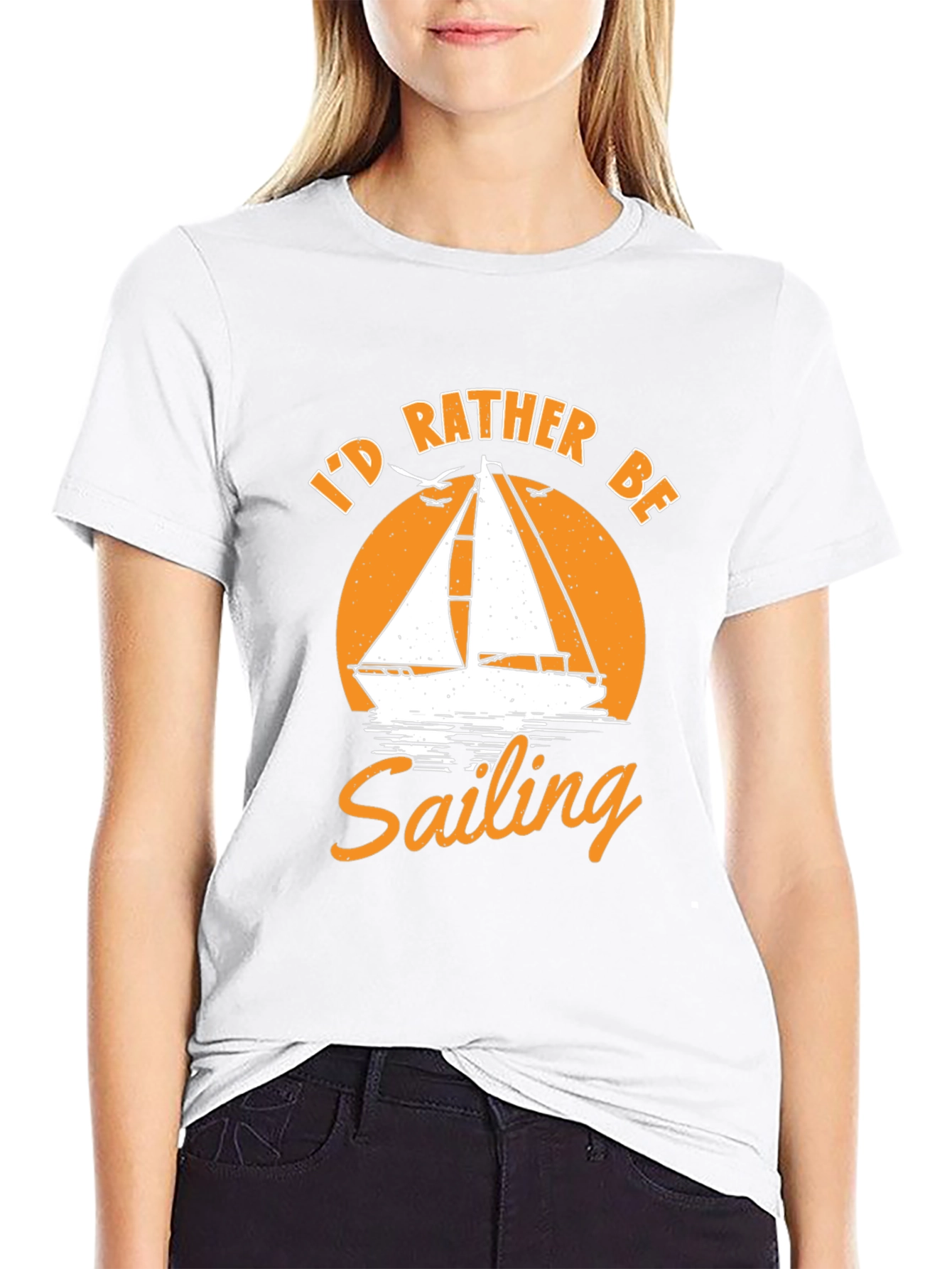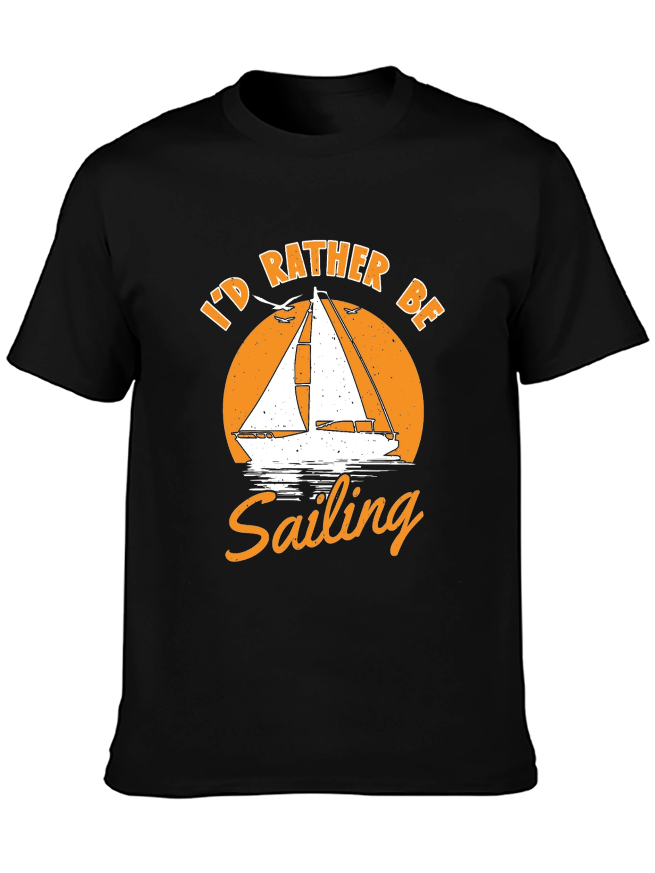This classic black t-shirt features a creative graphic design that any sailing enthusiast will appreciate. The design includes a sailboat silhouette set against an orange circular backdrop, evoking the feeling of a sunset on the water. Above the design, the phrase "I'd Rather Be" is printed in bold orange lettering, while the word "Sailing" is prominently displayed below. Made from what appears to be a soft, comfortable fabric, this tee is perfect for casual wear. Whether you're on deck or simply dreaming of the open sea, this t-shirt lets you express your love for sailing in style. A great addition to any wardrobe, ideal for everyday comfort and a laid-back look.