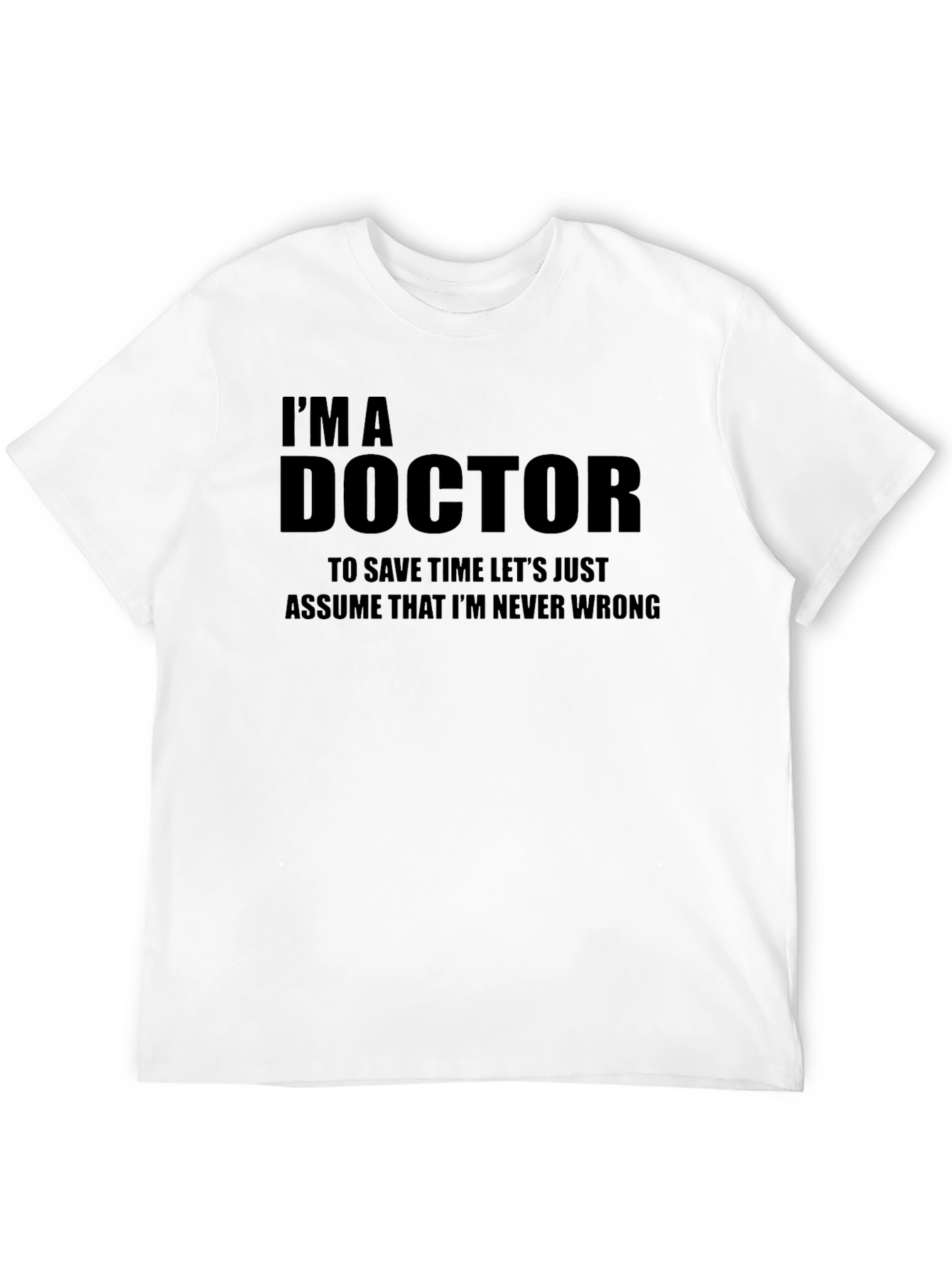 This stylish black t-shirt makes a bold statement. Featuring the phrase 'I'M A DOCTOR' in prominent lettering, followed by the humorous line 'TO SAVE TIME LET'S JUST ASSUME THAT I'M NEVER WRONG.' This tee is perfect for doctors with a sense of humor. The shirt appears to be made from a comfortable, breathable fabric, ensuring a great fit and feel. It's a great conversation starter, ideal for wearing to work, casual outings, or even at home. Show off your profession with this unique and fun design. Guaranteed to turn heads and bring a smile to everyone's face.