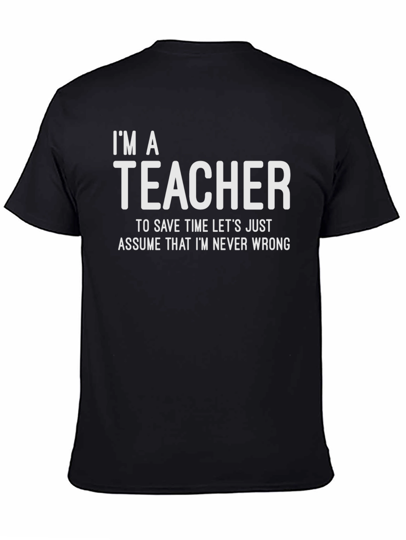 This classic fit tee features a bold statement for teachers. The black t-shirt sports the phrase "I'm A Teacher" prominently at the top, followed by the humorous text "To Save Time Let's Just Assume That I'm Never Wrong." Made from a soft, comfortable fabric, this shirt is perfect for casual wear in the classroom or on the go. It's a fun and lighthearted way for teachers to express their personality and showcase their profession with a touch of humor. This tee makes a great gift for any teacher with a sense of humor. Wear it with pride and a smile!