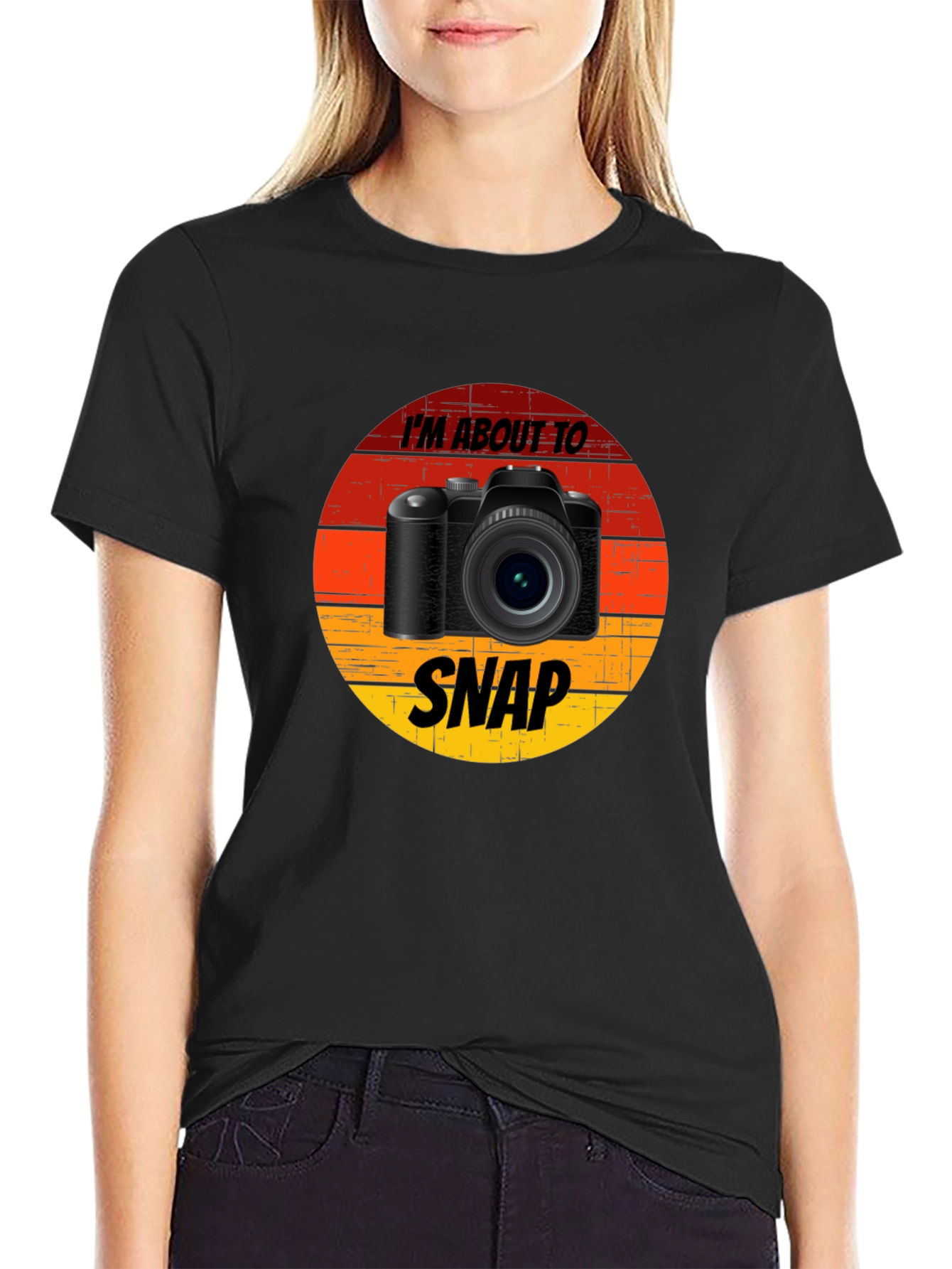 Capture attention with this unique black graphic tee! The shirt features a stylized camera within a retro-themed circle of red and yellow stripes. The bold text 'I'M ABOUT TO SNAP' adds a playful touch. Made from comfortable material, this tee is perfect for casual wear and expressing your passion for photography. Pair it with jeans or shorts for a stylish and relaxed look. A great conversation starter for photographers and anyone who loves a clever design!