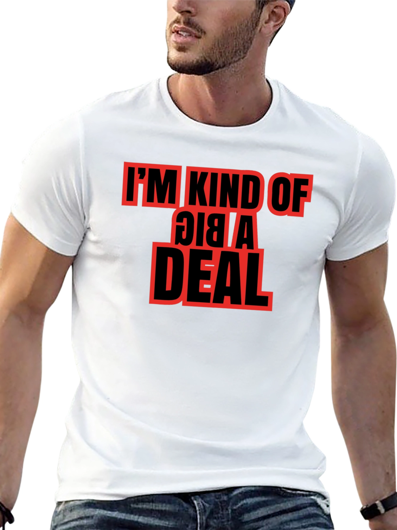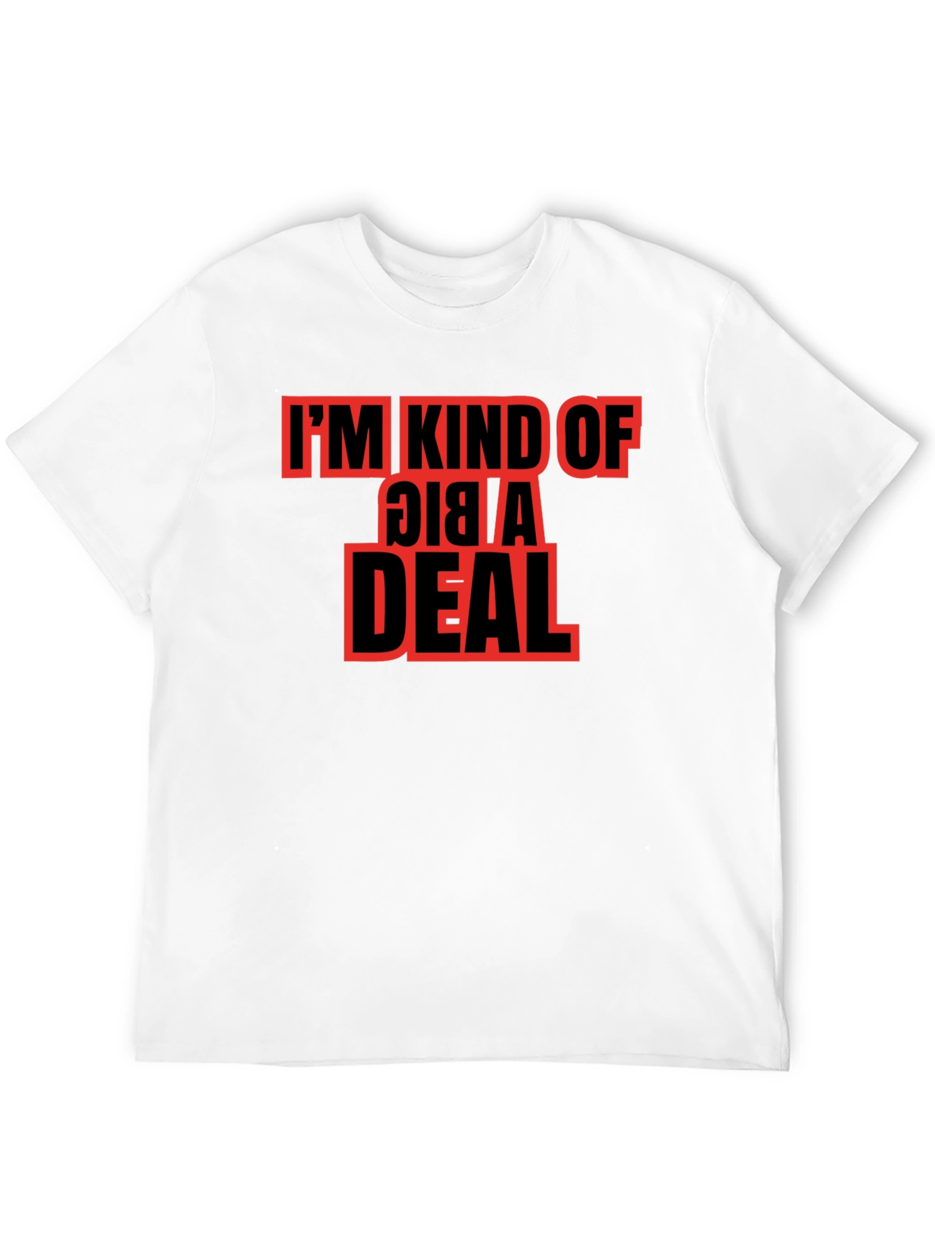 Showcase your sense of humor with this eye-catching black t-shirt. Featuring a bold, red graphic that reads "I'M KIND OF A BIG DEAL," this tee is sure to spark conversation. Made from a comfortable, breathable fabric, this shirt is perfect for casual outings, parties, or just lounging around. The classic crew neck and short sleeves offer a timeless fit that flatters any body type. This graphic tee is a great way to express your confident personality and make a statement. Get yours today and let the world know you're kind of a big deal!