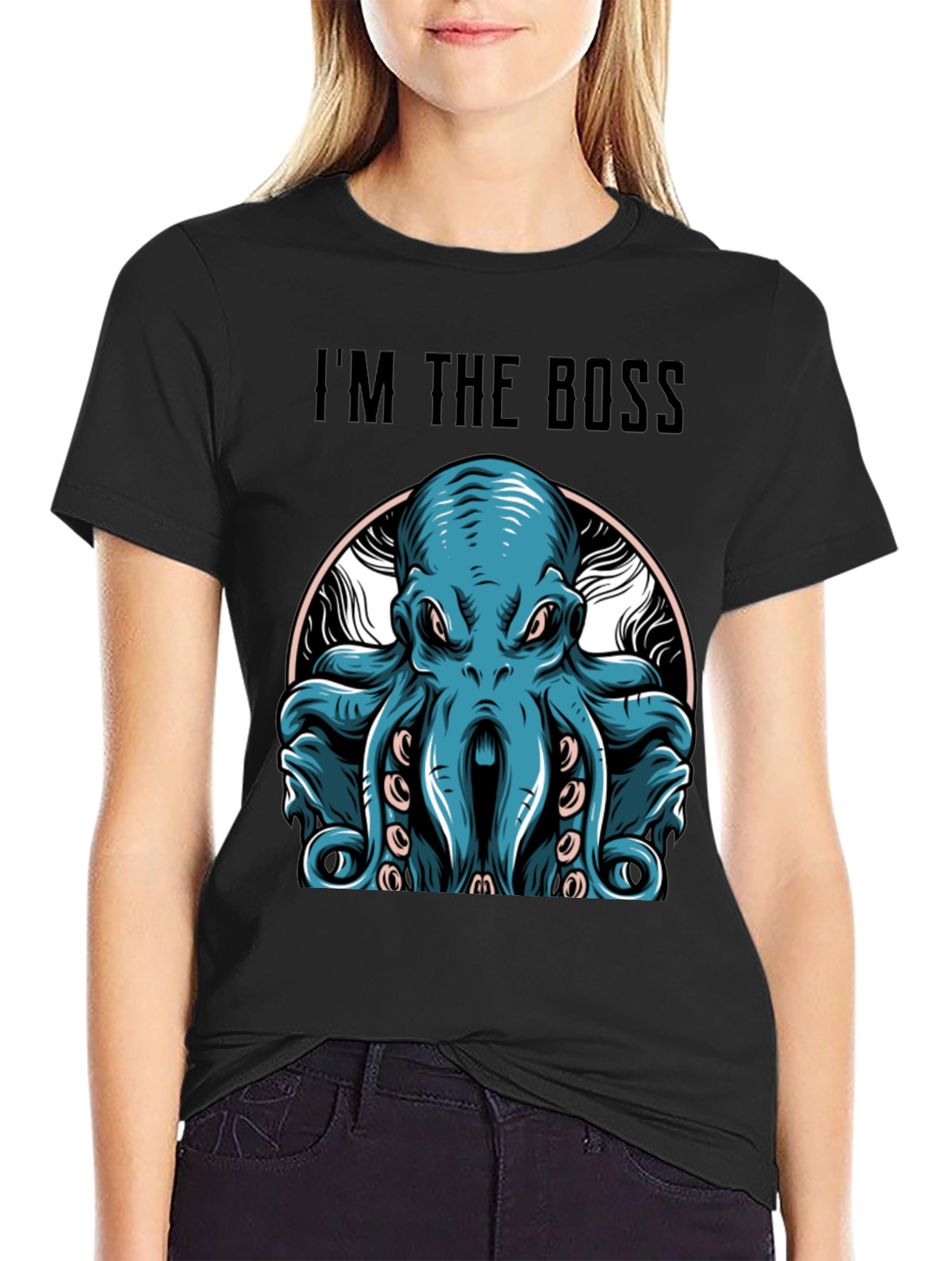 This striking black t-shirt features a bold graphic of an intimidating blue octopus. The words "I'M THE BOSS" are printed above the illustration. This shirt is a statement piece, perfect for those who like to express their confidence and unique sense of humor. Made from a comfortable-looking fabric, this tee is ideal for casual wear, social gatherings, or as a standout addition to any wardrobe. Grab this unique octopus tee and show the world who's in charge!