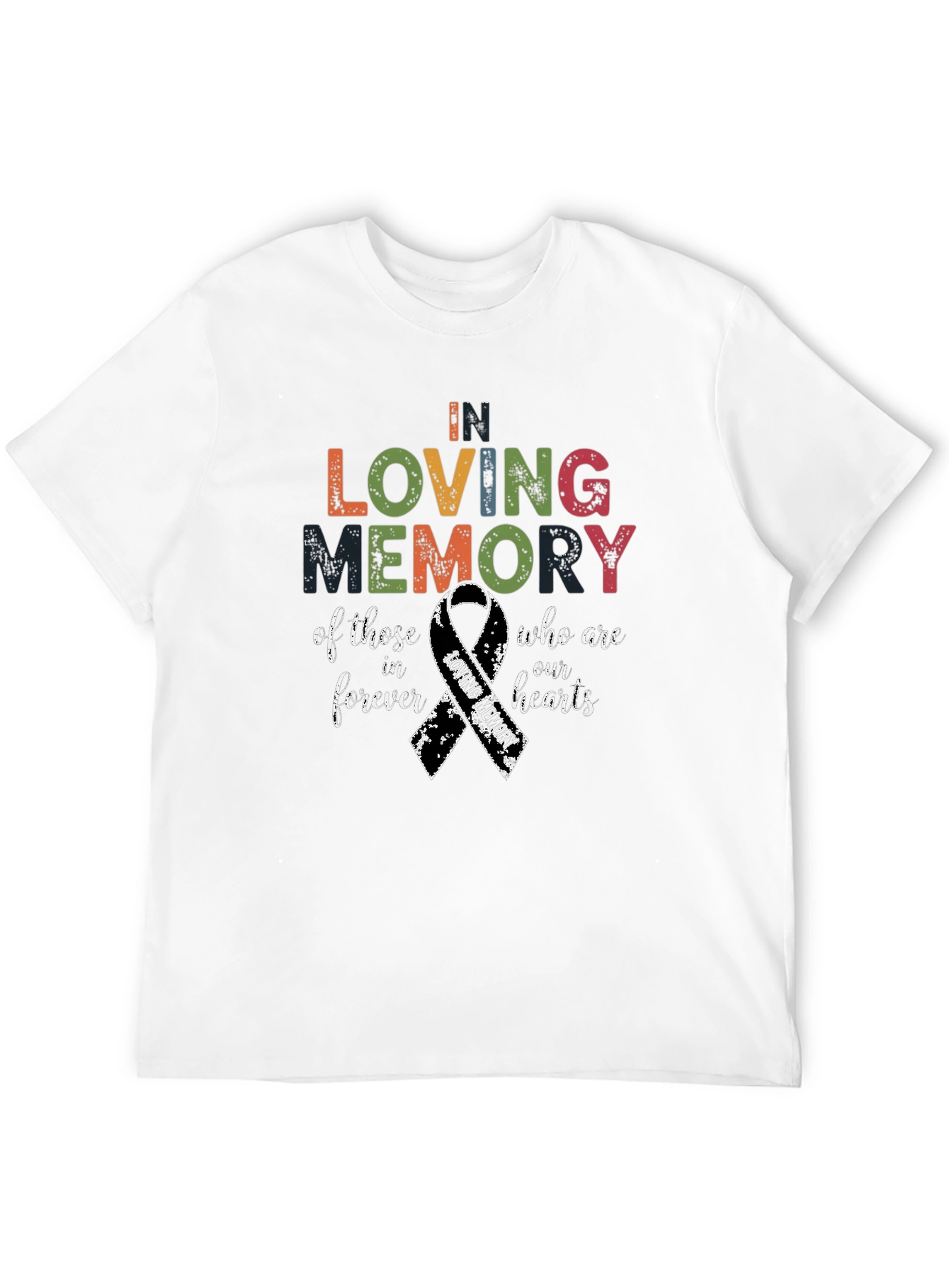 Honor loved ones with this stylish "In Loving Memory" graphic t-shirt. This black tee features a colorful design with the words "In Loving Memory" above a distressed ribbon. The text "of those in forever who are our hearts" surround the design. Made from comfortable materials, this shirt is perfect for memorial events, remembrance gatherings, or everyday wear to keep their memory alive. Show your support and keep their spirit with you always with this unique and meaningful t-shirt.