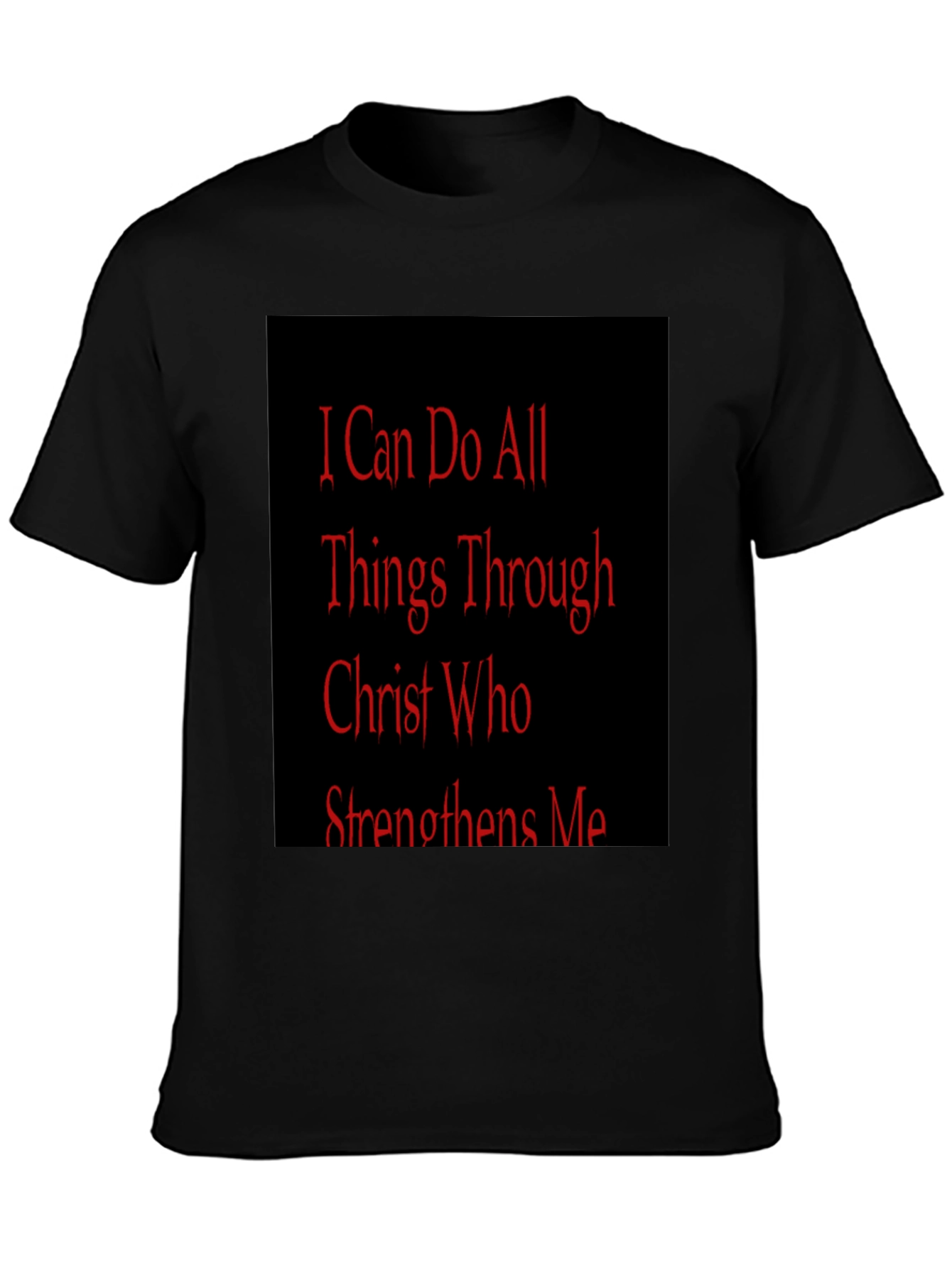 Express your faith with this bold, black T-shirt featuring the powerful message, "I Can Do All Things Through Christ Who Strengthens Me" in a striking red font. Crafted from a comfortable, breathable fabric, this short-sleeved tee is perfect for everyday wear, church events, or as a thoughtful gift for a loved one. The impactful message stands out, making it a conversation starter and a way to share your beliefs with the world. Let this T-shirt be a reminder of strength and inspiration in your daily life. Wear your faith proudly!