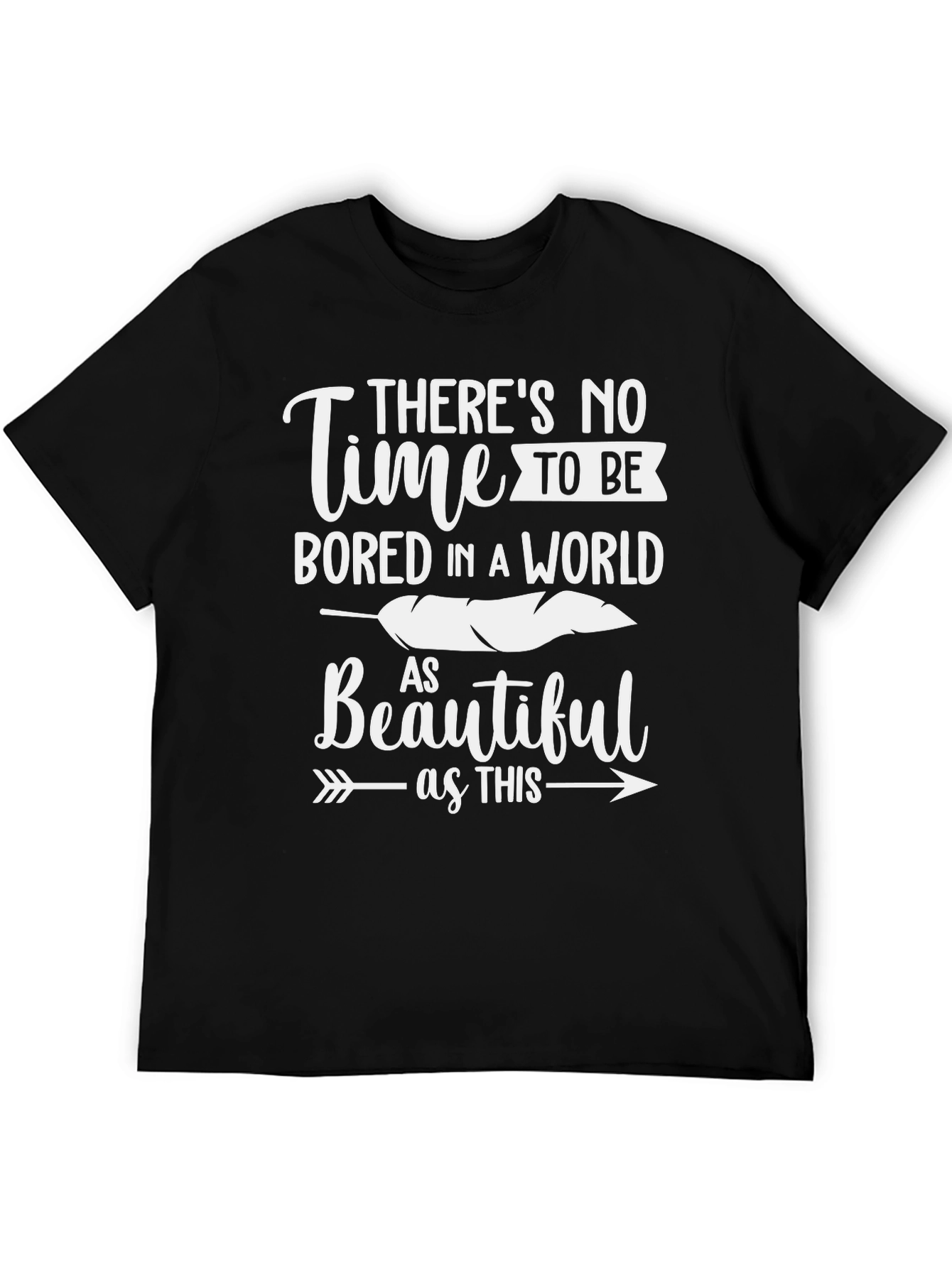 Show your love for life with this inspirational black t-shirt. The bold white graphic features the phrase 'There's No Time to Be Bored In A World As Beautiful As This,' complete with a feather design. Made from comfortable fabric, this tee is perfect for everyday wear. Whether you're exploring the outdoors, spending time with loved ones, or simply enjoying a day out, this t-shirt will remind you to appreciate the beauty of the world around you. A stylish and meaningful addition to any wardrobe, this tee is sure to inspire.