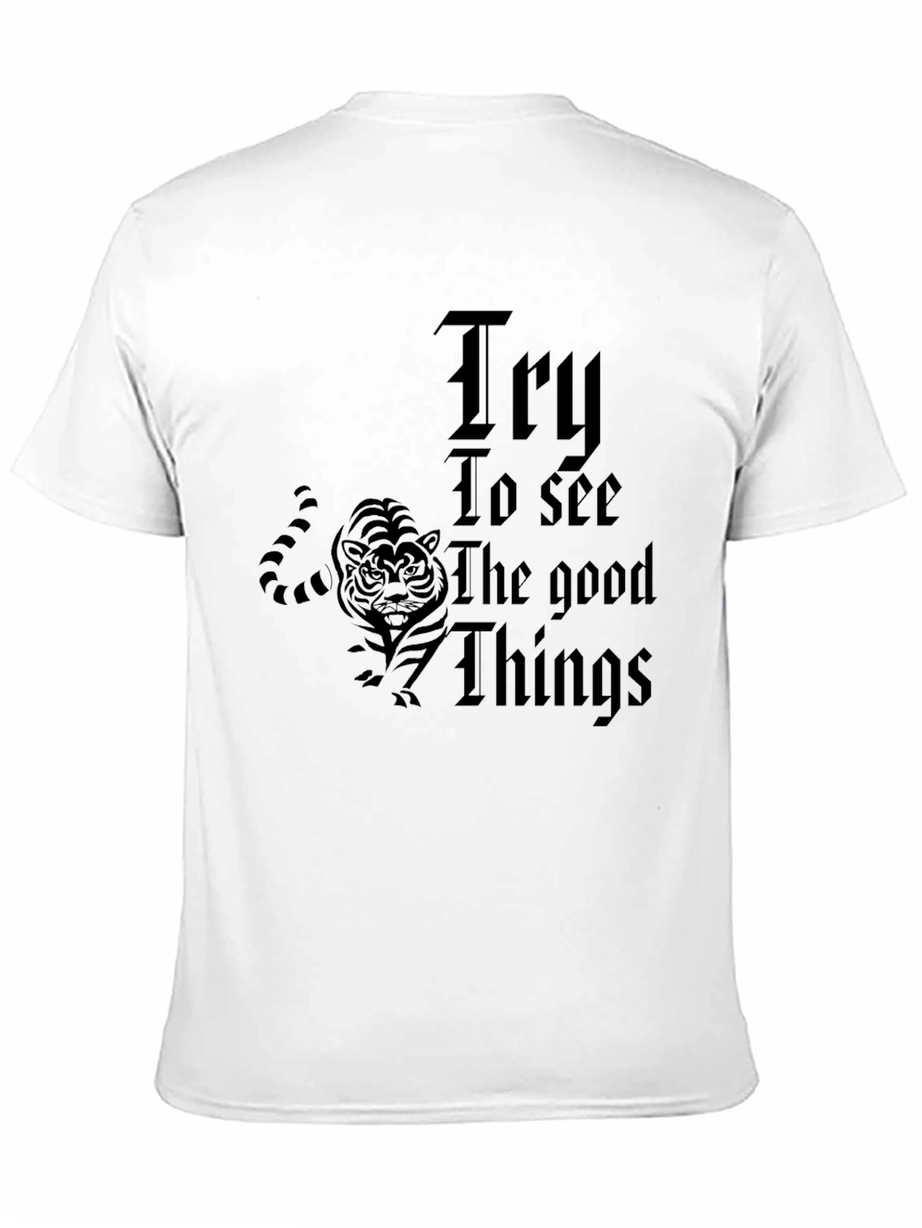 Showcase your positive outlook with this unique graphic T-shirt. This eye-catching tee features the phrase "Try To See the Good Things" in gothic-style lettering, complemented by a tiger graphic. The design is printed in a solid color on a comfortable, short-sleeved tee. Ideal for everyday wear, casual outings, or as a thoughtful gift, this shirt is sure to uplift spirits and spark conversations. Express yourself in style with this inspirational and fashion-forward piece. Perfect for those who appreciate meaningful messages and distinctive design.
