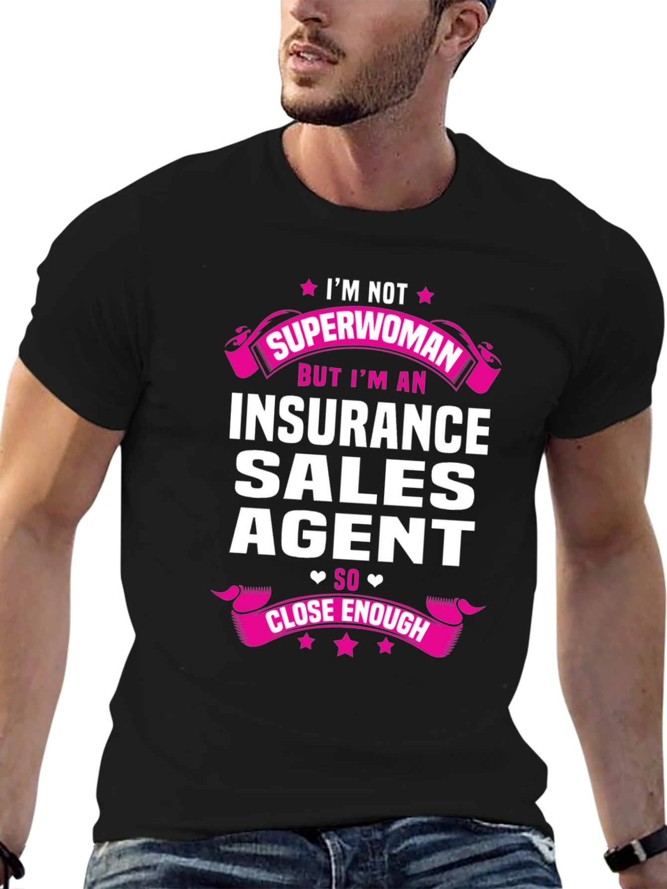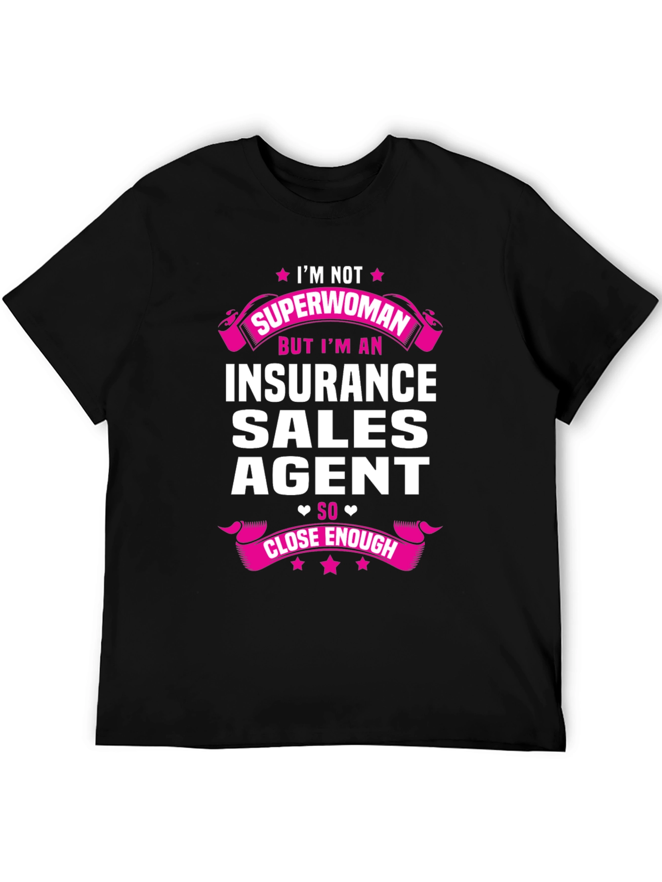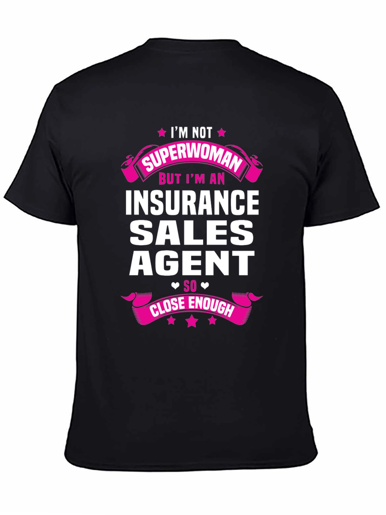 Show off your profession with this fun Insurance Sales Agent T-Shirt! The black tee features a humorous graphic design declaring "I'm Not Superwoman But I'm An Insurance Sales Agent So Close Enough," in bold white and pink lettering, complete with star and ribbon accents. This tee is made from a soft-looking material and offers a comfortable fit. Perfect for casual wear or as a conversation starter at work events. Grab this unique tee and wear your insurance pride with style!