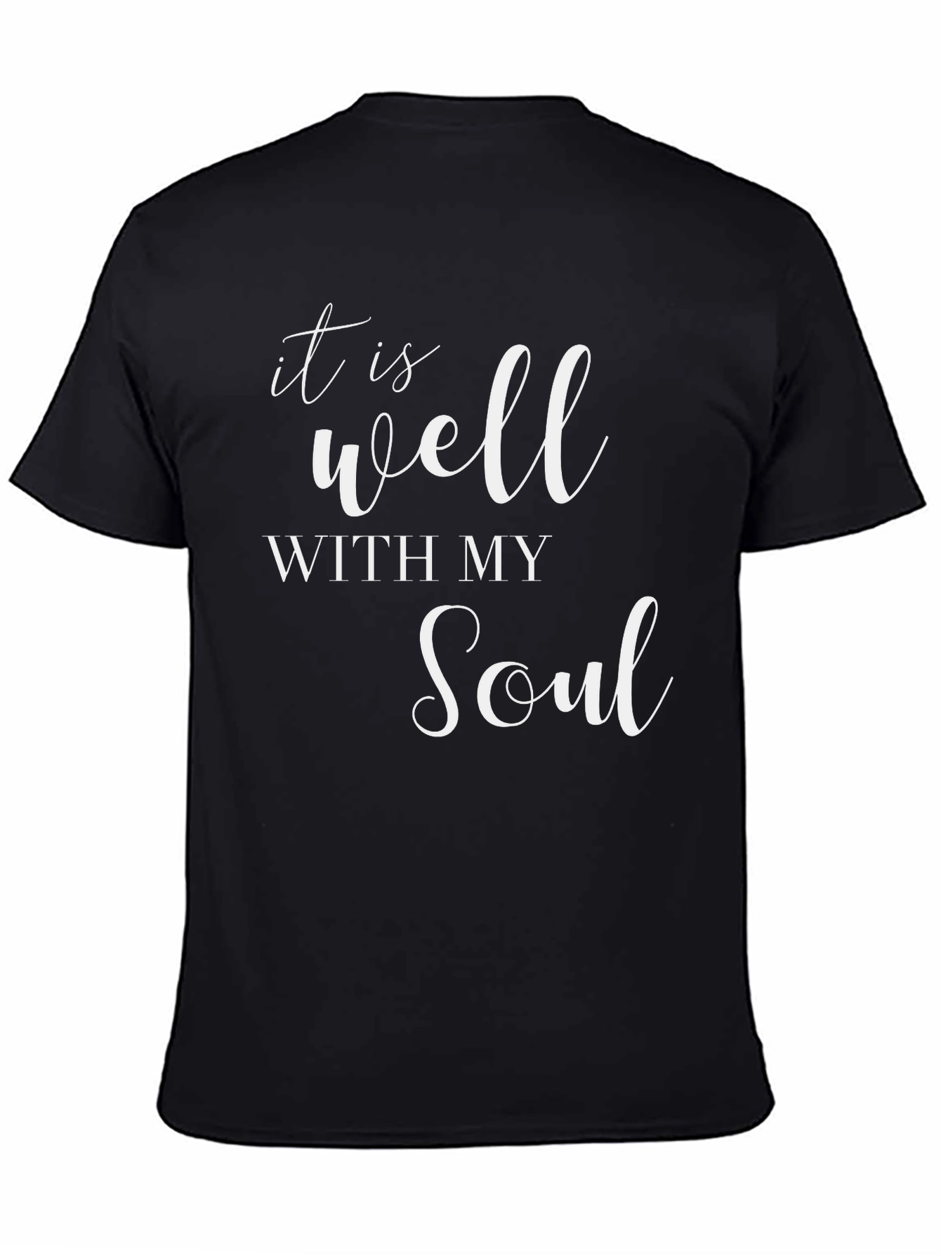 This classic black t-shirt features a crisp, clean "It Is Well With My Soul" graphic print in white. The shirt appears to be made from a soft, comfortable cotton blend, perfect for everyday wear. Its relaxed fit makes it ideal for casual outings, lounging at home, or as a thoughtful gift for someone seeking comfort and inspiration. Showcase your faith and style with this timeless and uplifting tee! Easy to pair with jeans, shorts, or layered under a jacket for a versatile look.