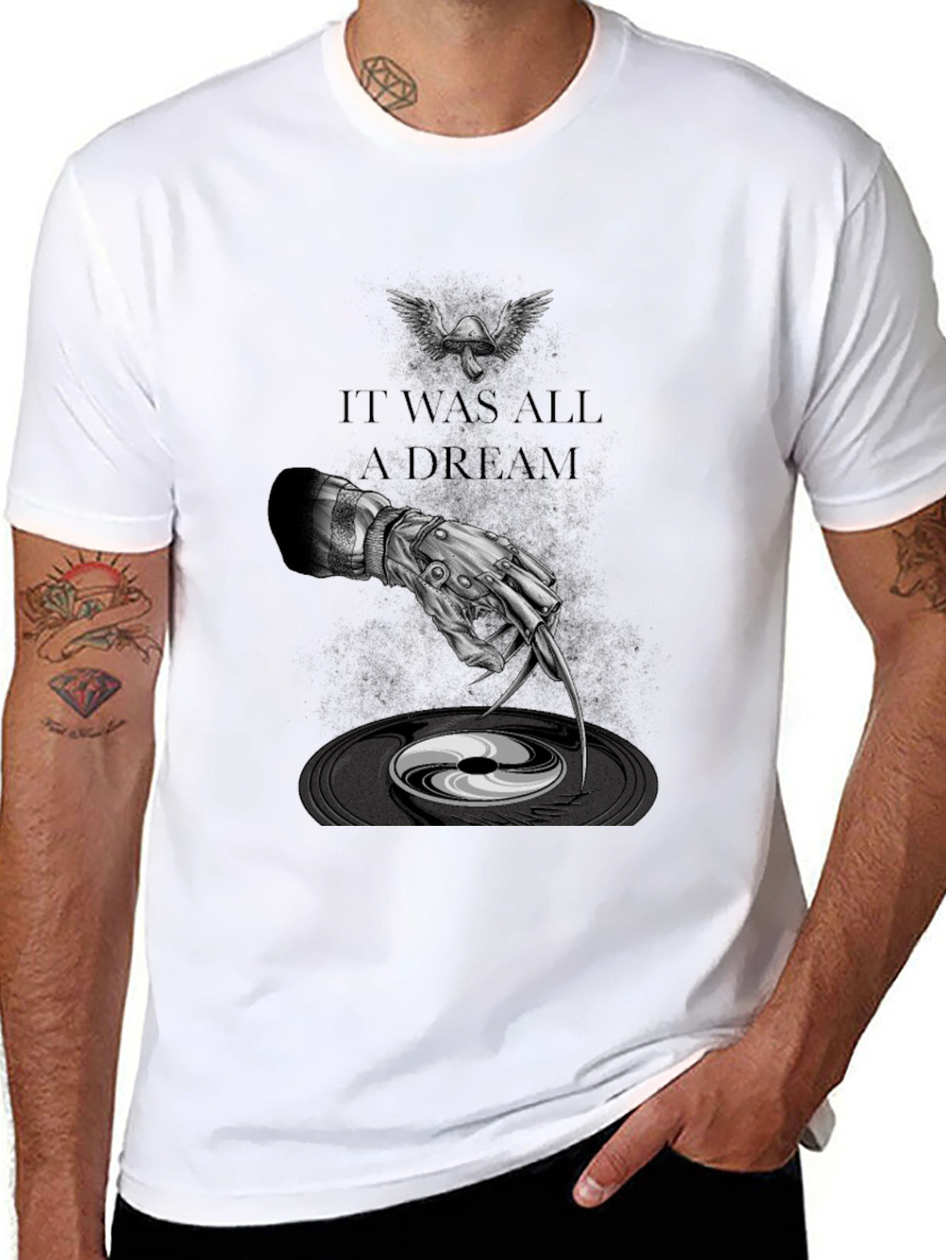 Embrace surreal style with this unique black graphic t-shirt. The design features a mechanical hand with blades posed above a spinning record, with the words "IT WAS ALL A DREAM" above. A mushroom with wings graphic sits above the text. This visually striking t-shirt is ideal for making a bold statement, perfect for casual wear, music events, or as a standout piece in your wardrobe. Made from comfortable materials, this t-shirt ensures both style and comfort. Add this exceptional shirt to your wardrobe and make a bold statement.