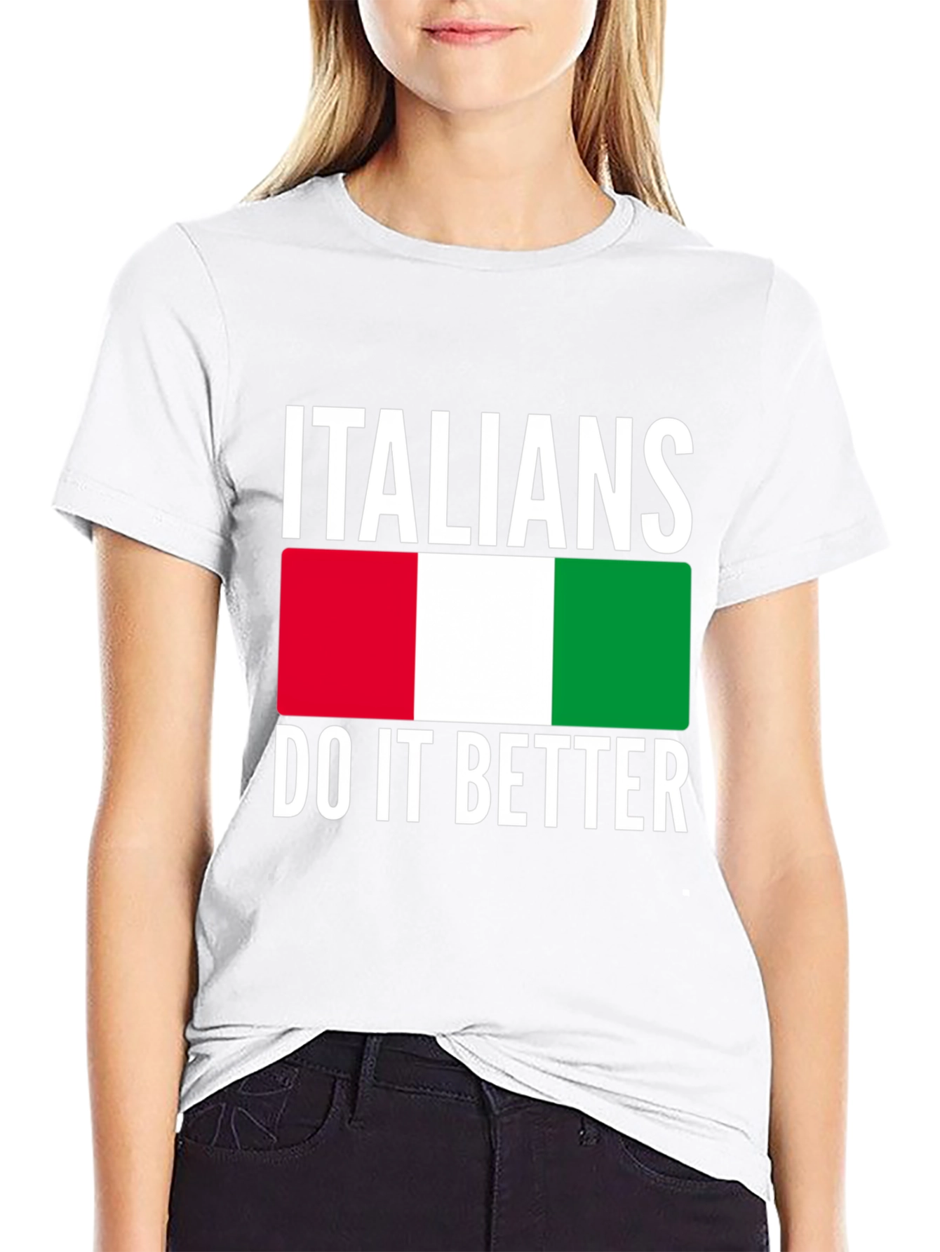 Show off your Italian pride with this stylish black t-shirt. This shirt features the phrase "Italians DO IT BETTER" printed in bold white letters above and below a representation of the Italian flag in green, white and red. Made from comfortable, breathable fabric, this tee is perfect for casual wear, Italian heritage celebrations, or as a fun gift for the Italian in your life. Let everyone know you appreciate the Italian way of life with this eye-catching and comfortable t-shirt. Wear it with pride!