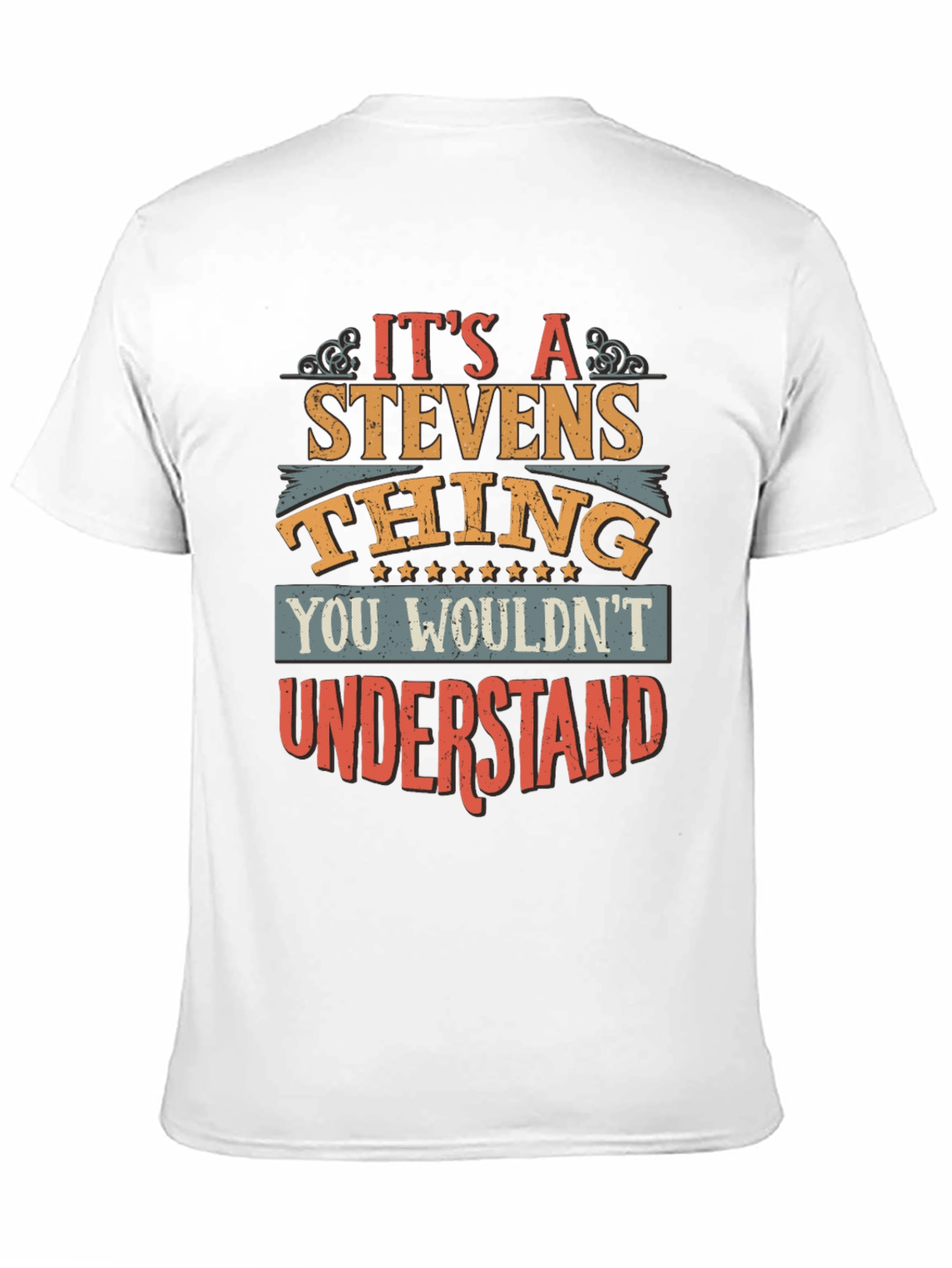 This classic black t-shirt features a unique graphic design that proudly proclaims, "It's a Stevens Thing You Wouldn't Understand". The text is displayed in a vintage-inspired layered style, using a warm color palette of orange, tan, and muted blue. The design is perfect for individuals with the last name Stevens, adding a touch of humor and personality to your wardrobe. Made from a comfortable-looking fabric, this tee is ideal for casual outings, family gatherings, or as a fun gift for the Stevens in your life. Express your unique identity with this eye-catching and conversation-starting t-shirt.