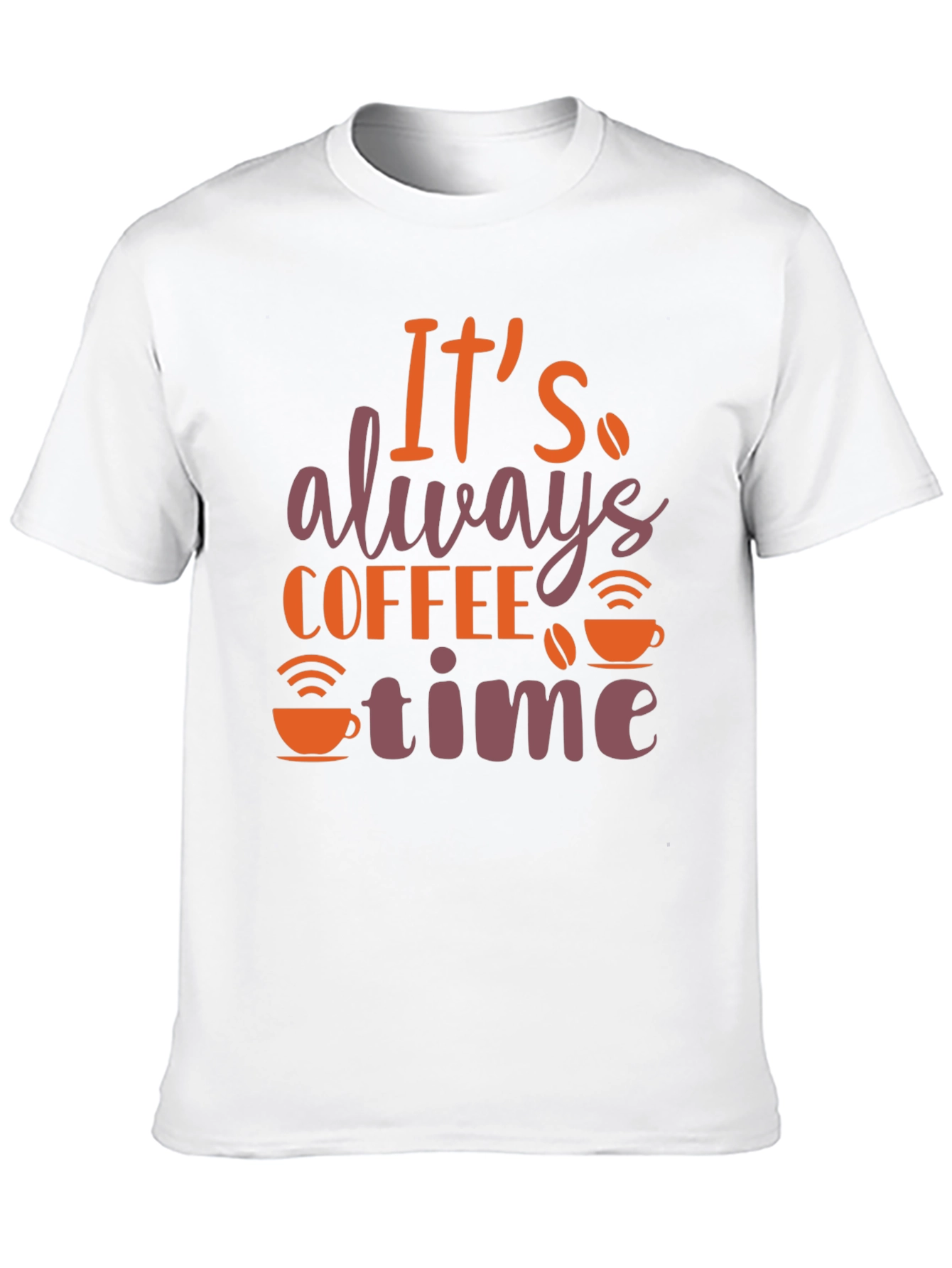 This stylish black t-shirt features a fun and eye-catching design perfect for coffee lovers. The graphic incorporates the text "It's always coffee time" in a mix of orange and purple hues, creatively using coffee bean and cup illustrations. Made from a comfortable-looking fabric, this tee is ideal for casual wear, whether you're relaxing at home, meeting friends for a coffee, or running errands. Show off your love for coffee with this unique and comfortable t-shirt.