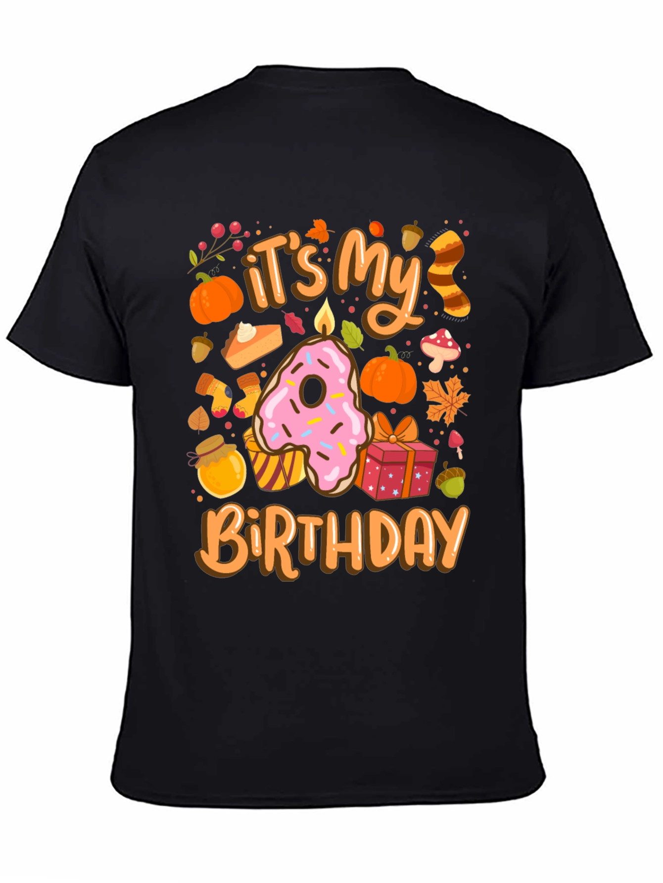 Celebrate a special 4th birthday in style with this adorable t-shirt! The black tee features a fun, colorful graphic with the words "It's My Birthday" above a large donut-shaped number '4' adorned with pink frosting and sprinkles. Surrounding the festive design are seasonal elements like pumpkins, acorns, pie, and a gift box, adding a touch of autumn charm. This tee is perfect for a birthday party, family gathering, or any casual occasion to showcase the birthday girl or boy's big day. Comfortable and eye-catching, it's sure to make the celebration extra special.