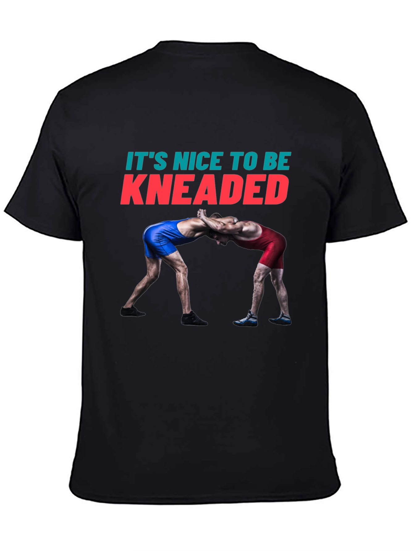 This striking black t-shirt features a humorous design with the phrase "IT'S NICE TO BE KNEADED" printed in bold, contrasting colors. Below the text is a vivid image of two wrestlers grappling. This unique design makes the shirt a conversation starter and a fun addition to any casual wardrobe. Made from a comfortable-looking fabric, this short-sleeved tee is perfect for everyday wear, workouts, or showing off your love for wrestling with a touch of humor. Whether you're a wrestling fan or just appreciate a good pun, this shirt is sure to make a statement. Pair it with your favorite jeans or shorts for a relaxed and stylish look.