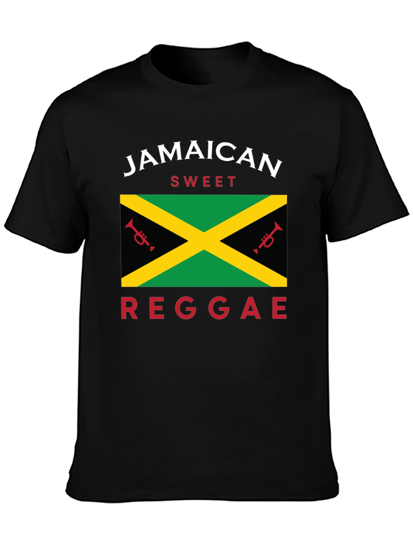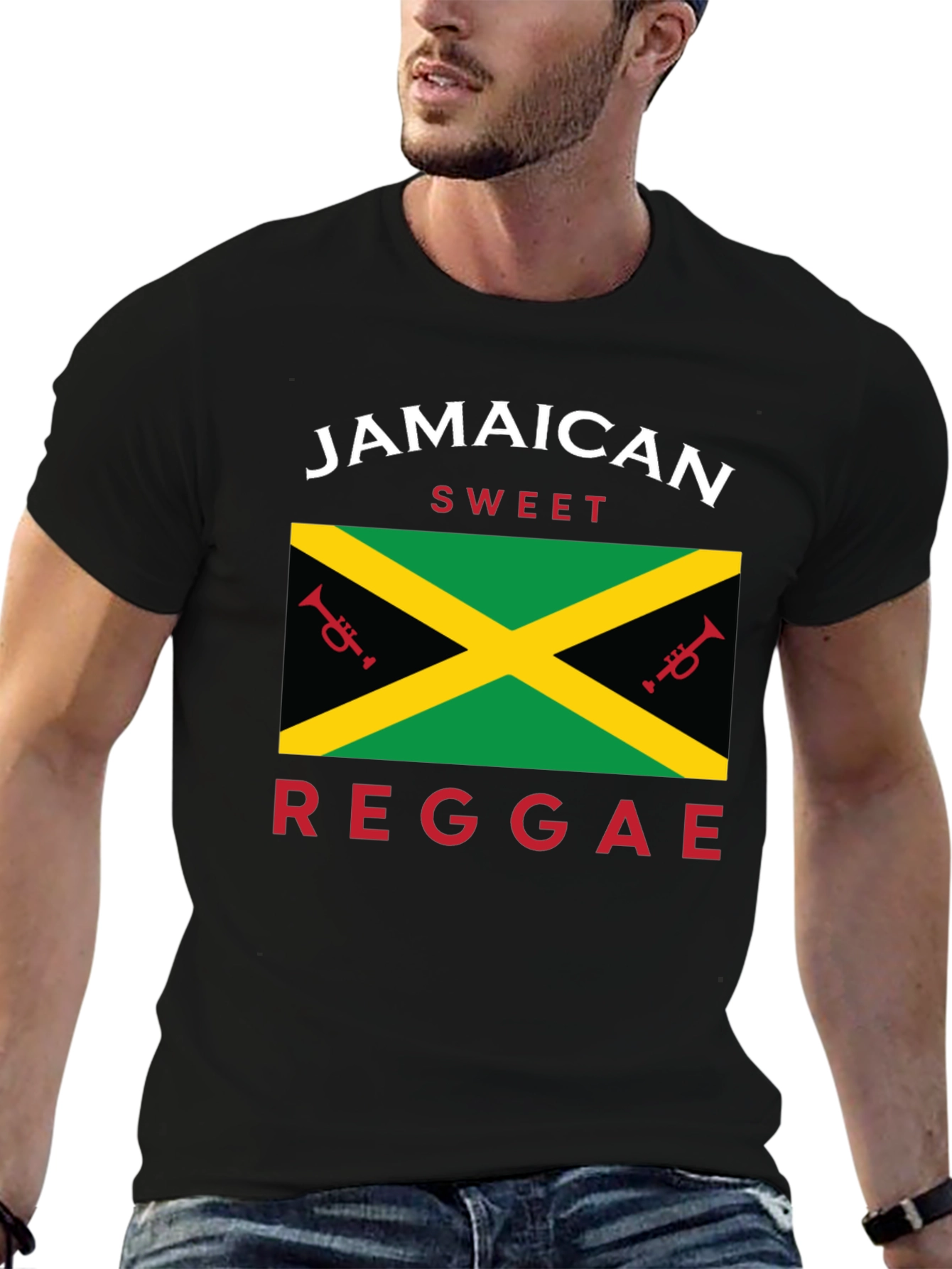 Showcase your love for reggae with this stylish black t-shirt. The design features the Jamaican flag with trumpets. The words 'Jamaican' and 'Reggae' are boldly displayed, making a statement. Made from comfortable, breathable fabric, this tee is perfect for everyday wear or music events. Get ready to express your passion for sweet reggae!