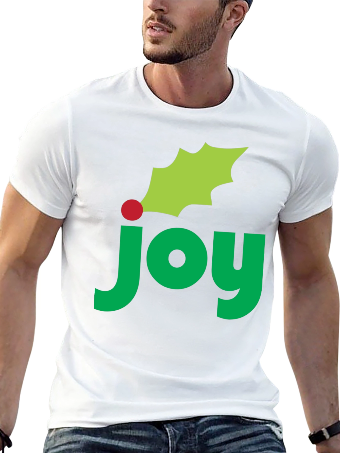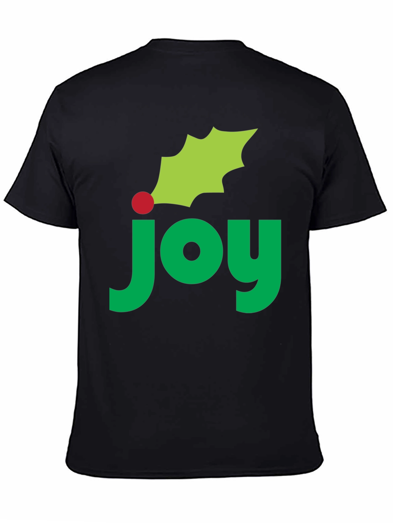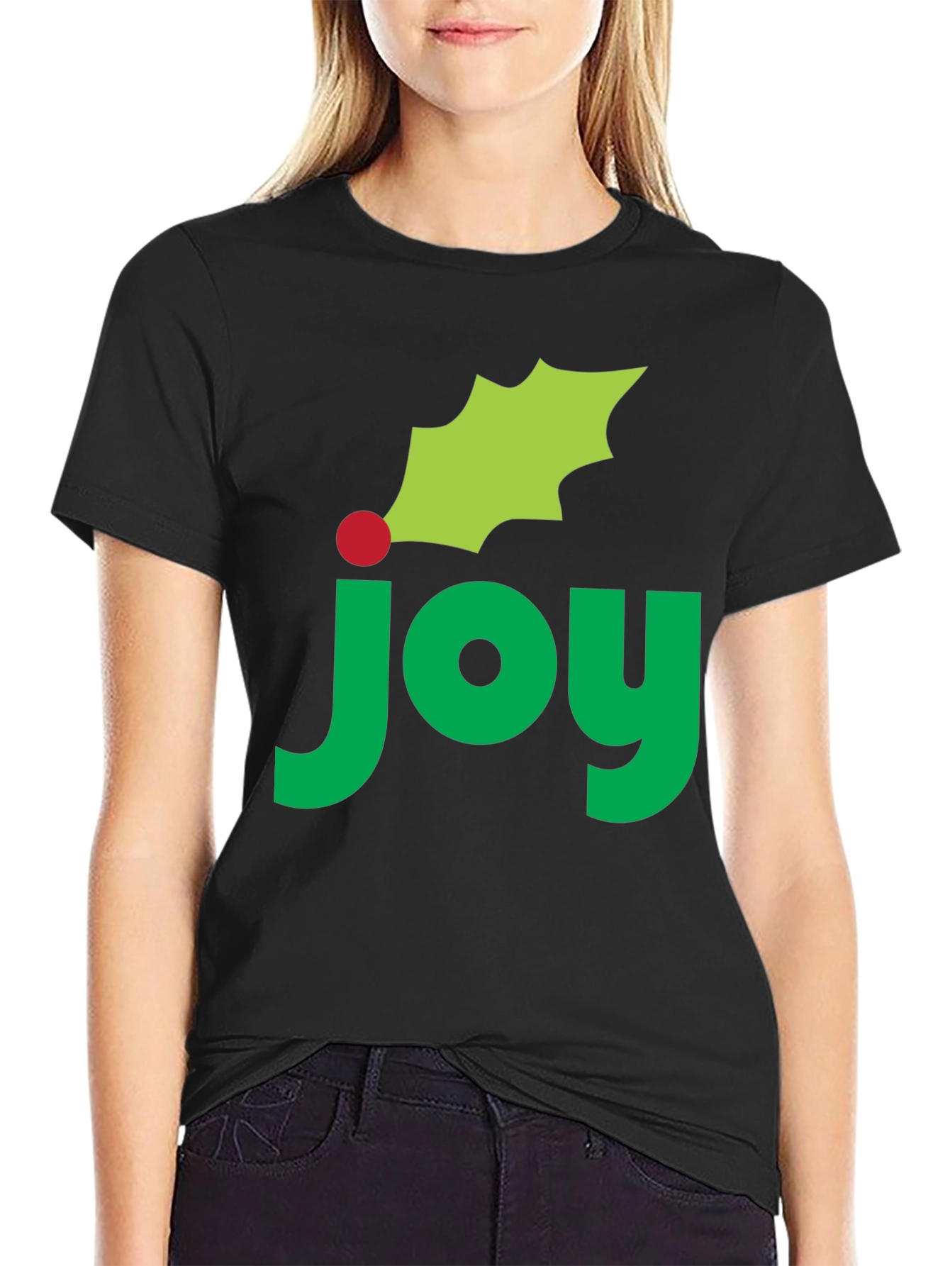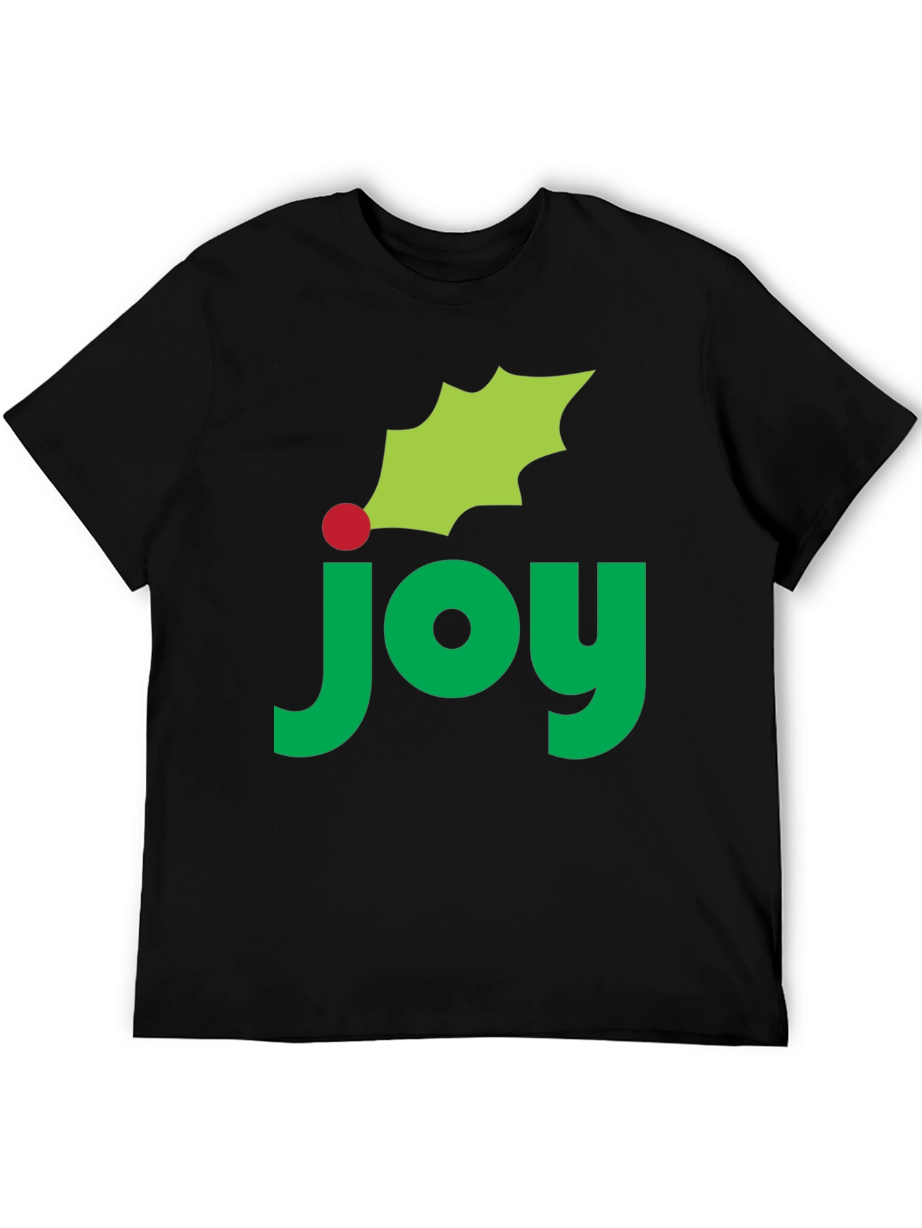 Spread holiday cheer with this fun and festive t-shirt! The design features the word "joy" in vibrant green, playfully incorporated with a classic Christmas holly design above. The holly leaves are a complementary green, with a bright red berry accent. This stylish t-shirt is made of a soft, comfortable black fabric, ideal for casual wear during the holiday season. Perfect for Christmas parties, family gatherings, or just showing off your holiday spirit. Get yours now and celebrate joyfully!