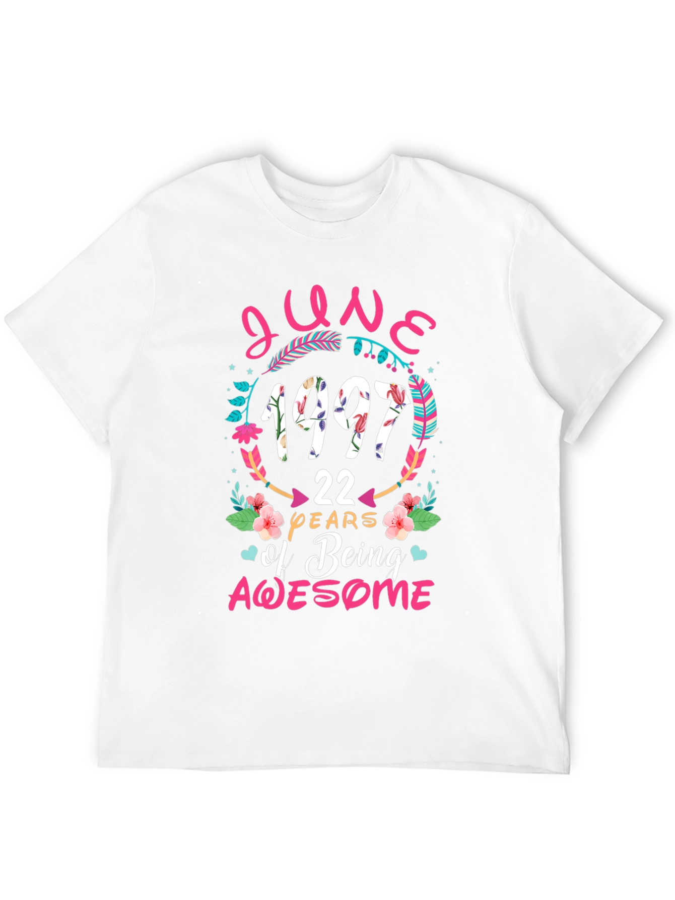 Celebrate a June 1997 birthday with this unique black t-shirt! Featuring a vibrant, floral-themed design with the year "1997" and the phrase "22 Years of Being Awesome," this tee is perfect for birthday celebrations. The colorful graphic includes decorative feathers and a circular arrangement of floral elements in shades of pink, blue, and green. Made from comfortable fabric, this shirt offers a casual fit suitable for everyday wear or special occasions. Gift it to a loved one or wear it yourself to show off your awesome 1997 vintage!