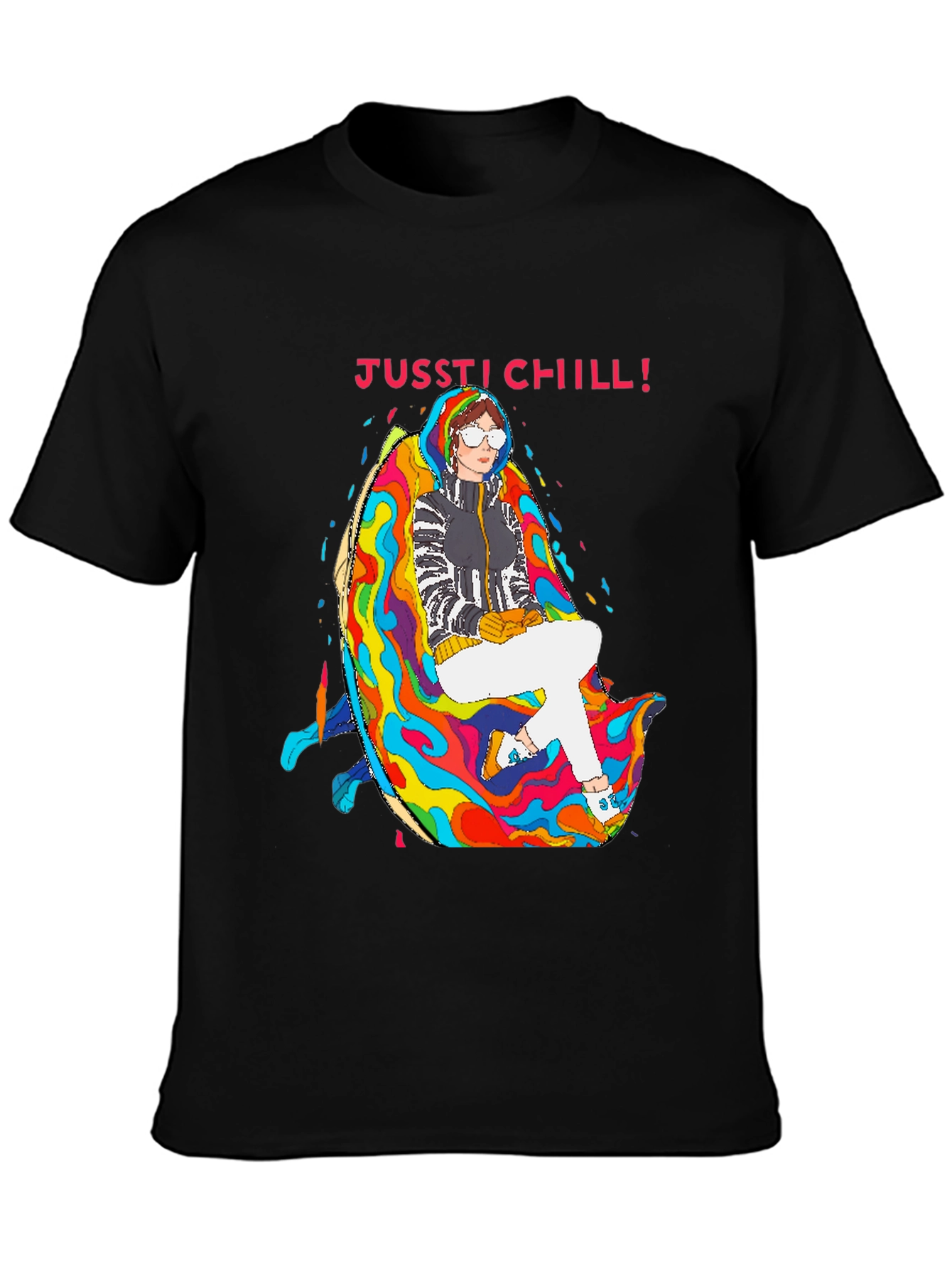 Stay cool and stylish in this eye-catching black graphic tee. Featuring a vibrant, colorful design of a relaxed figure and the phrase "Jusst Chill!", this tee is perfect for expressing your laid-back personality. The design includes a hooded figure in glasses in a colorful, artistic style, sitting on an abstract colorful seat. The shirt is comfortable and versatile, suitable for casual outings, lounging at home, or making a statement wherever you go. Grab yours today and let the good vibes flow!