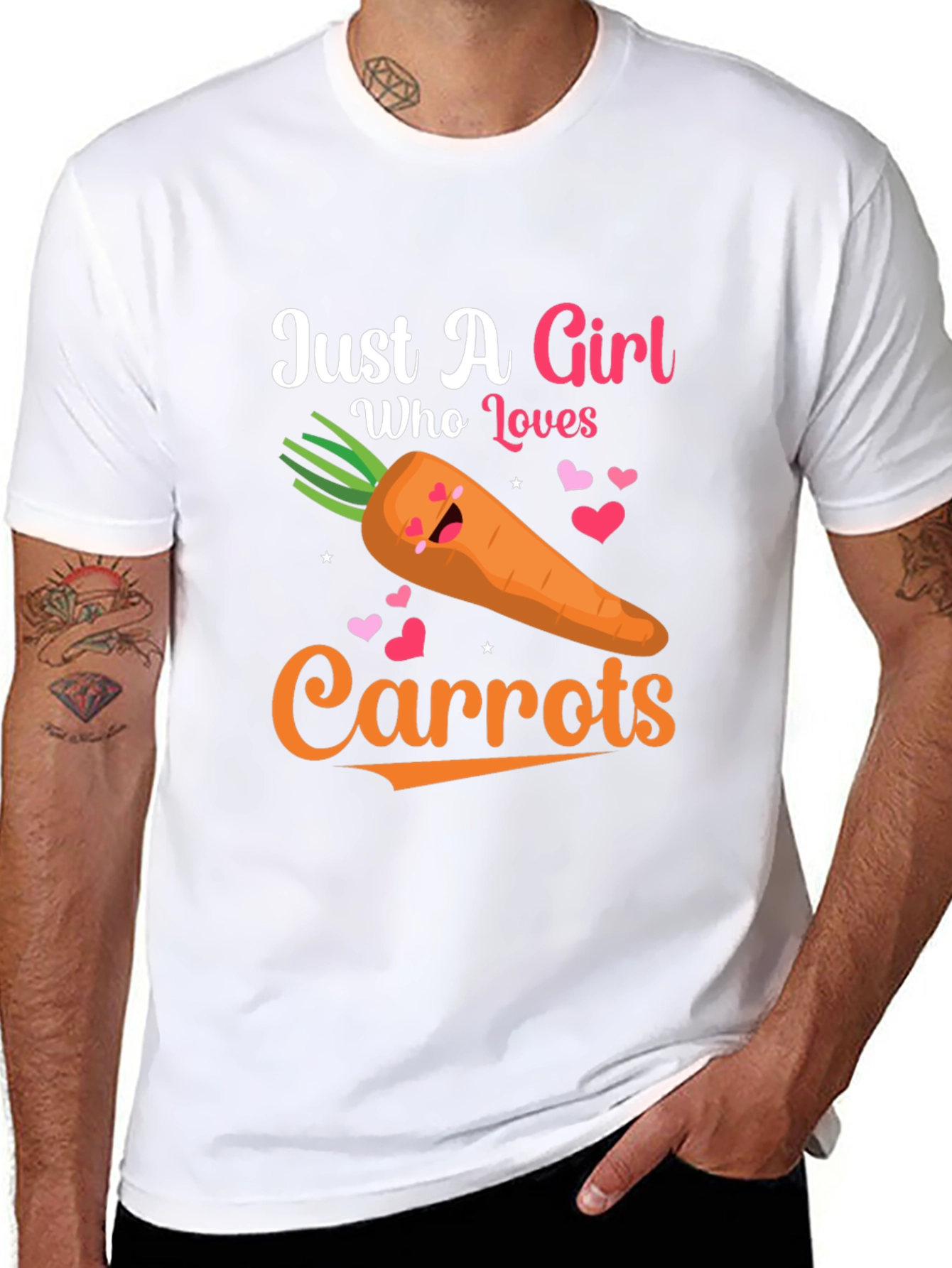 Show off your love for carrots with this adorable black t-shirt! Featuring a fun graphic design that reads 'Just A Girl Who Loves Carrots' with cute heart accents. A playful, smiling carrot is the centerpiece. Ideal for carrot enthusiasts, vegetarians, or anyone who loves whimsical, comfortable apparel. This tee is perfect for casual outings, farmer's markets, or lounging at home. The design is eye-catching and sure to spark conversations. A great gift idea for the carrot lover in your life! Soft and comfortable fabric ensures you'll love wearing it all day long.