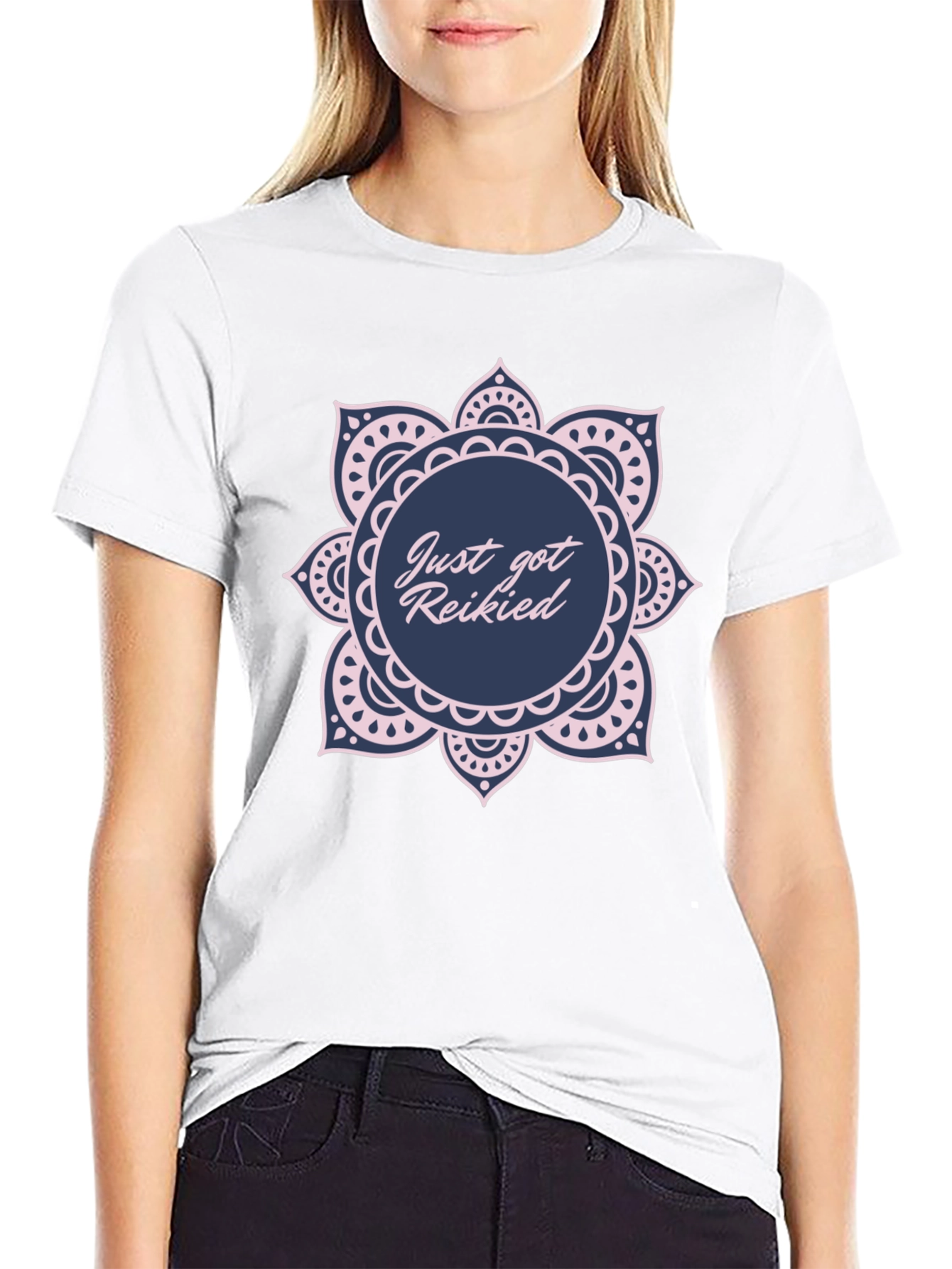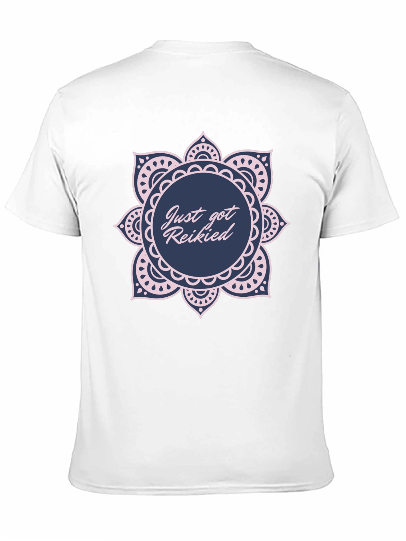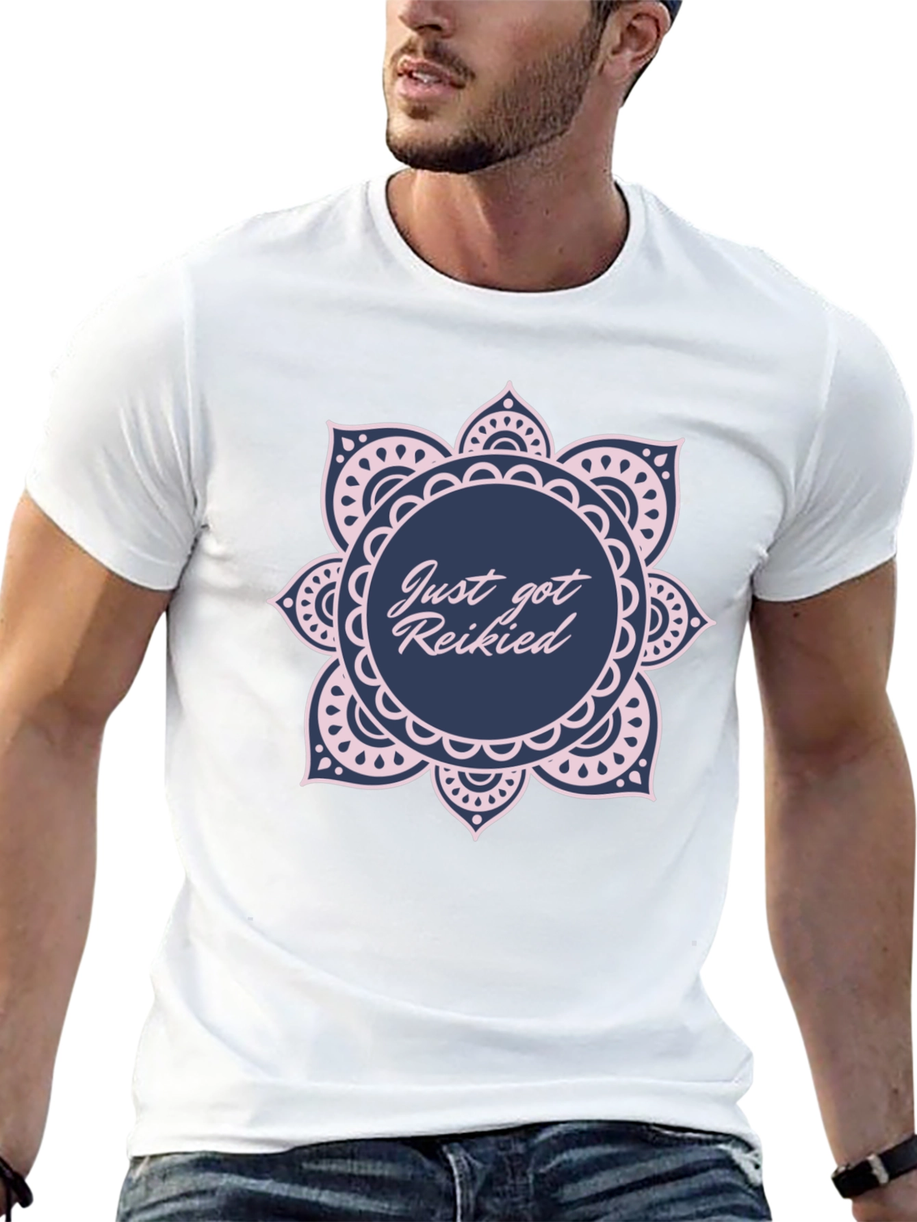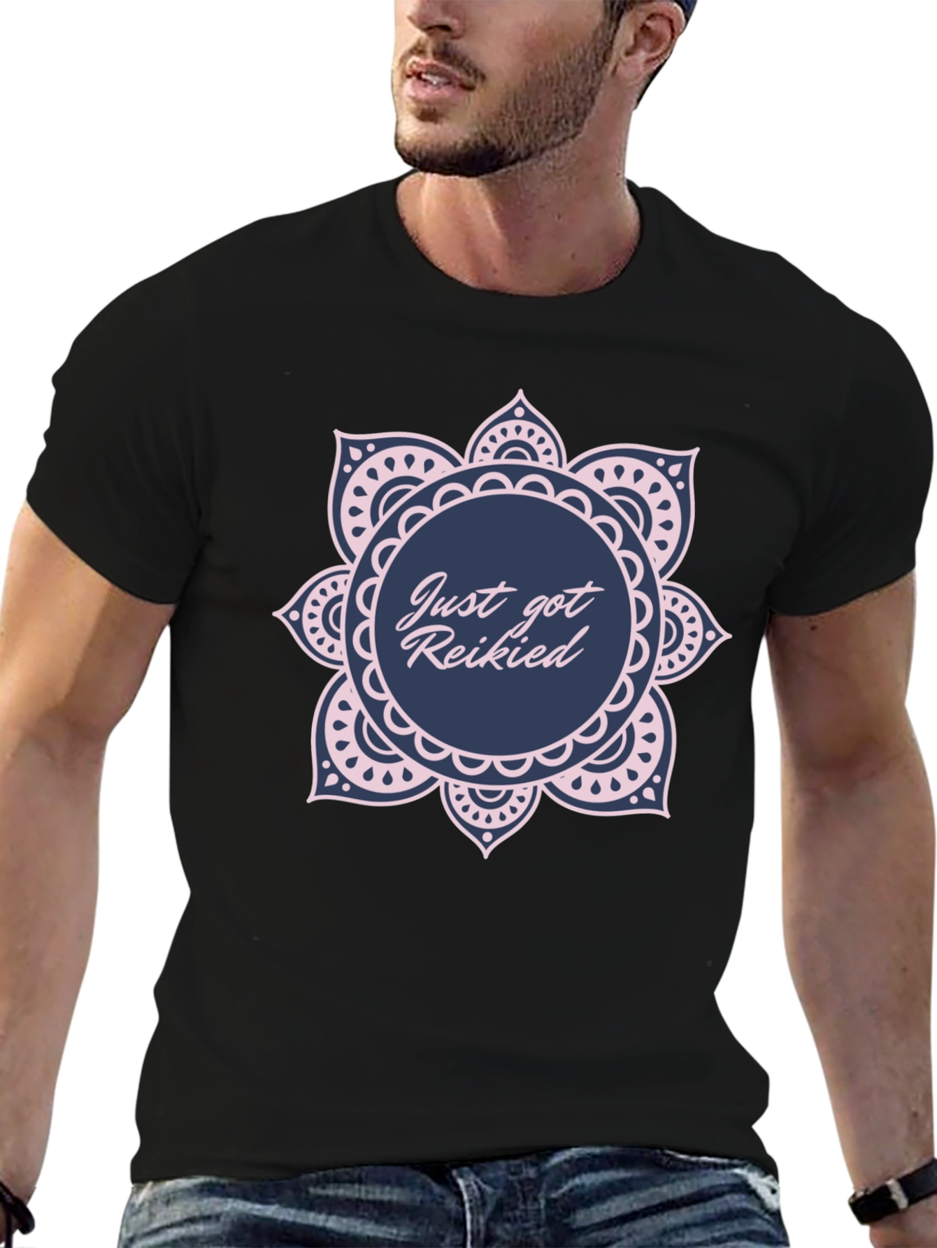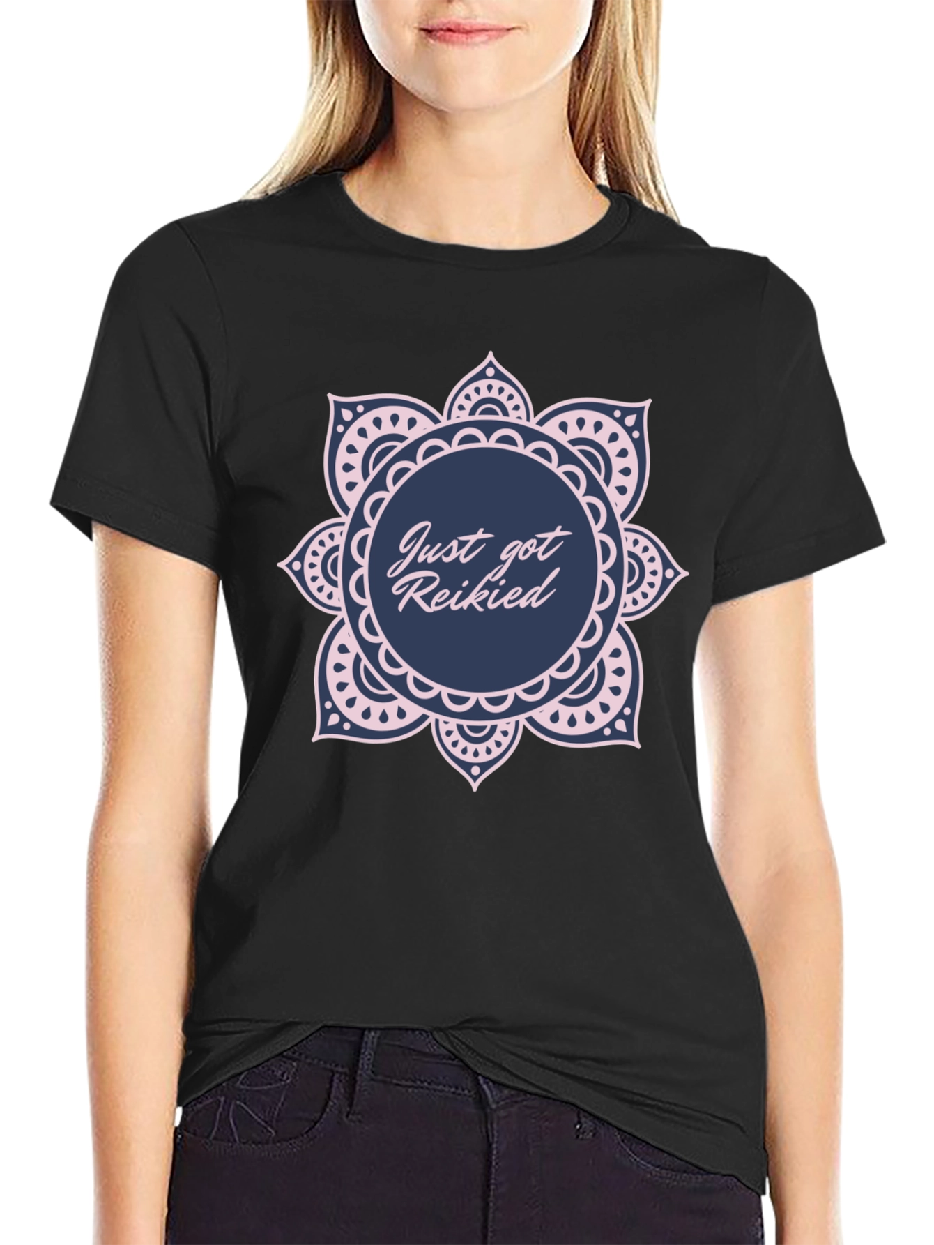 Embrace tranquility with this stylish black t-shirt. Featuring a captivating mandala design with the phrase "Just Got Reiki'd," this tee blends comfort with a touch of spiritual wellness. The soft, breathable fabric ensures all-day comfort, while the striking graphic makes a statement. Ideal for yoga sessions, meditation retreats, or casual wear, this t-shirt is perfect for those seeking relaxation and mindful living. Elevate your wardrobe and embrace the calming energy of reiki with this unique and eye-catching piece.