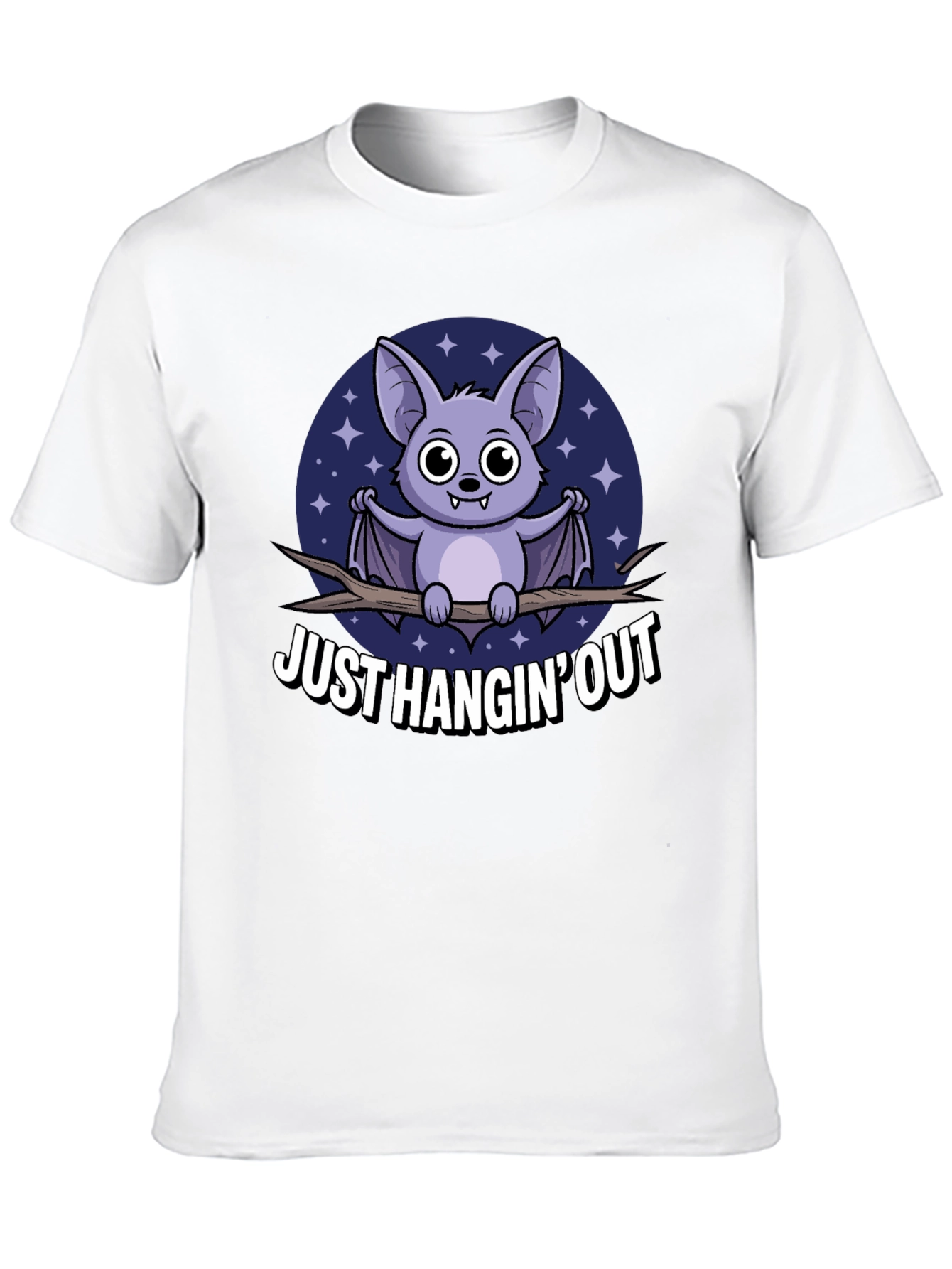 This black t-shirt features a playful and adorable cartoon bat graphic. The bat is depicted hanging from a branch against a backdrop of a blue circle with twinkling stars, accompanied by the phrase "JUST HANGIN' OUT" in bold, white lettering. The shirt is made from a comfortable-looking fabric, ideal for casual wear. It's a fun and quirky design that is sure to spark conversation. Perfect for Halloween, bat enthusiasts, or anyone who loves a touch of whimsy in their wardrobe. Get ready to show off your laid-back style with this unique and eye-catching t-shirt.