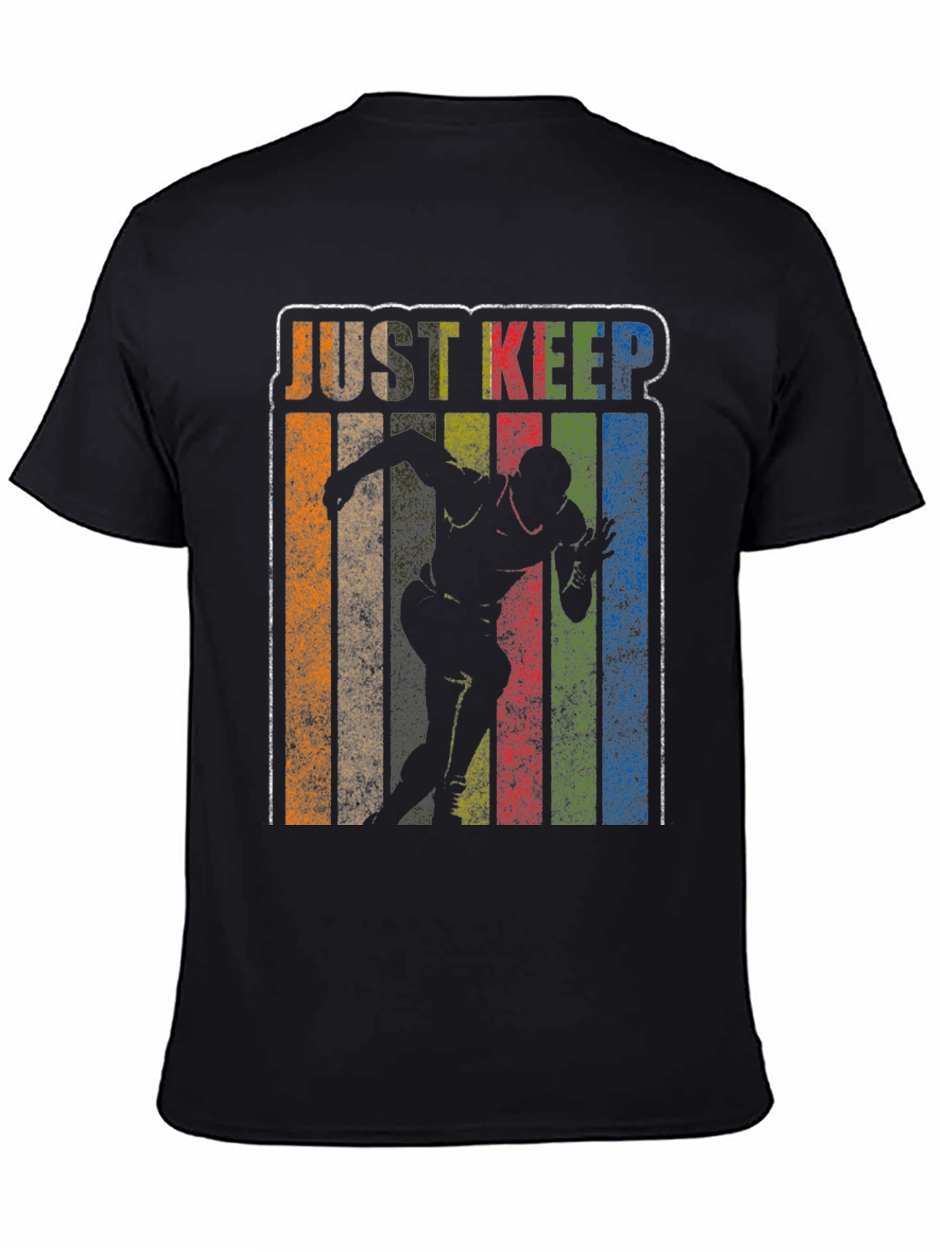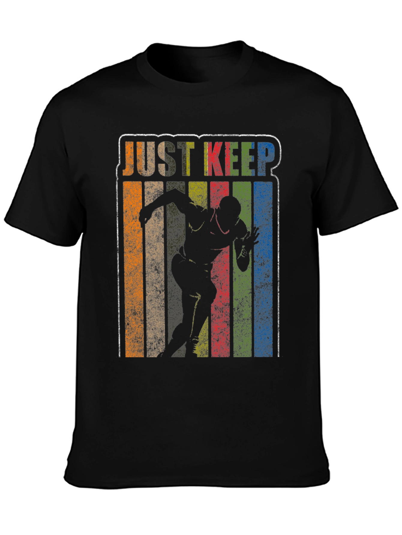 Show off your love for running with this vintage-inspired graphic tee. Featuring a bold silhouette of a runner over a retro striped background, this t-shirt makes a statement. The words "Just Keep" are printed in a distressed, colorful style, adding to the vintage feel. Made from a comfortable, breathable fabric, this shirt is perfect for everyday wear or workouts. The classic crew neck design and relaxed fit ensure all-day comfort. Whether you're hitting the track, running errands, or just lounging around, this t-shirt is a great way to express your passion for running and add a retro touch to your wardrobe. It also makes a great gift for runners.