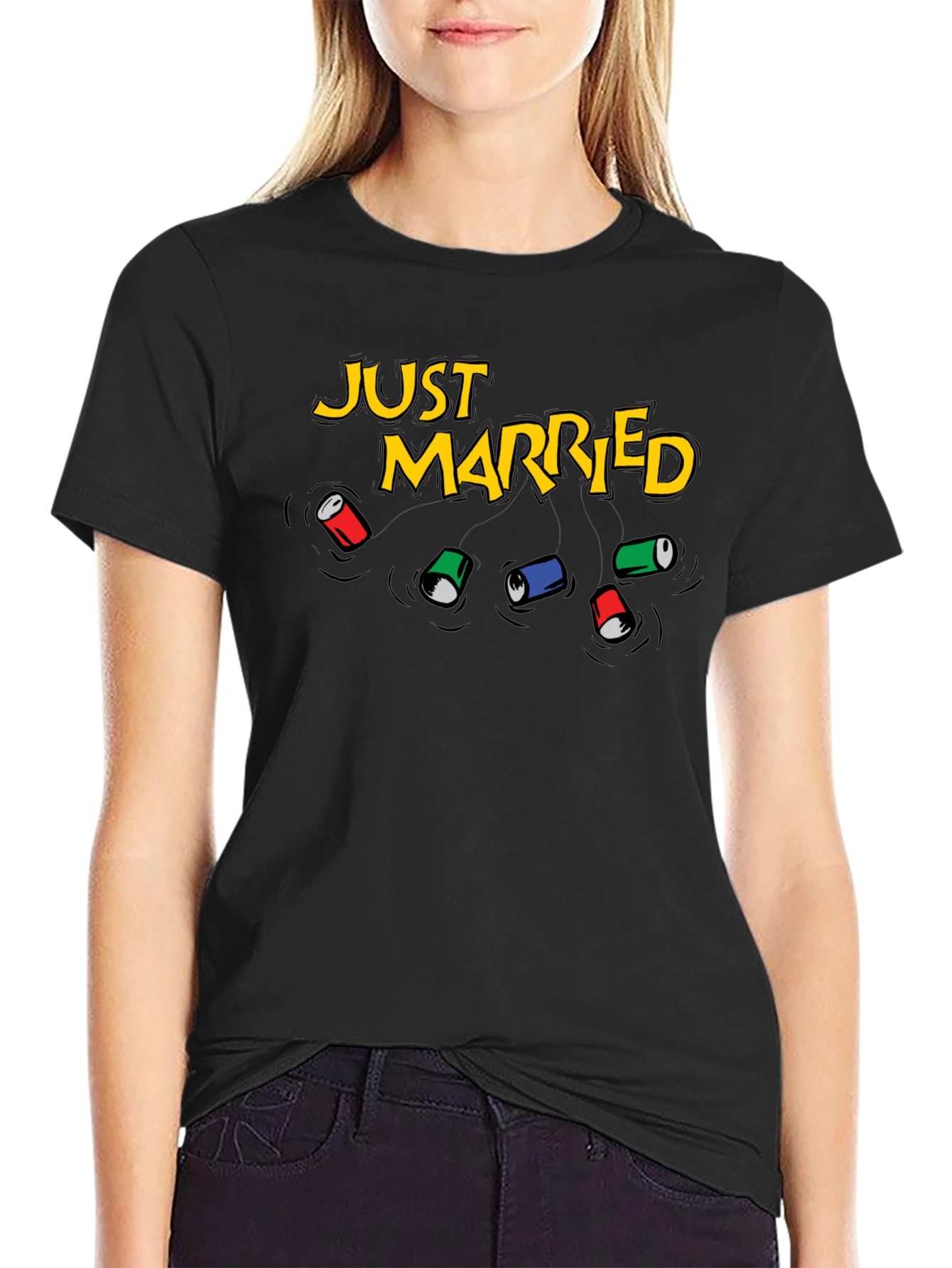 Celebrate your new status with this fun and quirky "Just Married" t-shirt. The black tee features the words "Just Married" in a bold, yellow font, accompanied by colorful tin cans trailing behind. This playful design is perfect for newlyweds looking to announce their union with a touch of humor and style. Made from a comfortable fabric, this t-shirt is ideal for casual outings, honeymoon adventures, or even a fun wedding reception. Let everyone know you're the happy couple with this eye-catching tee!
