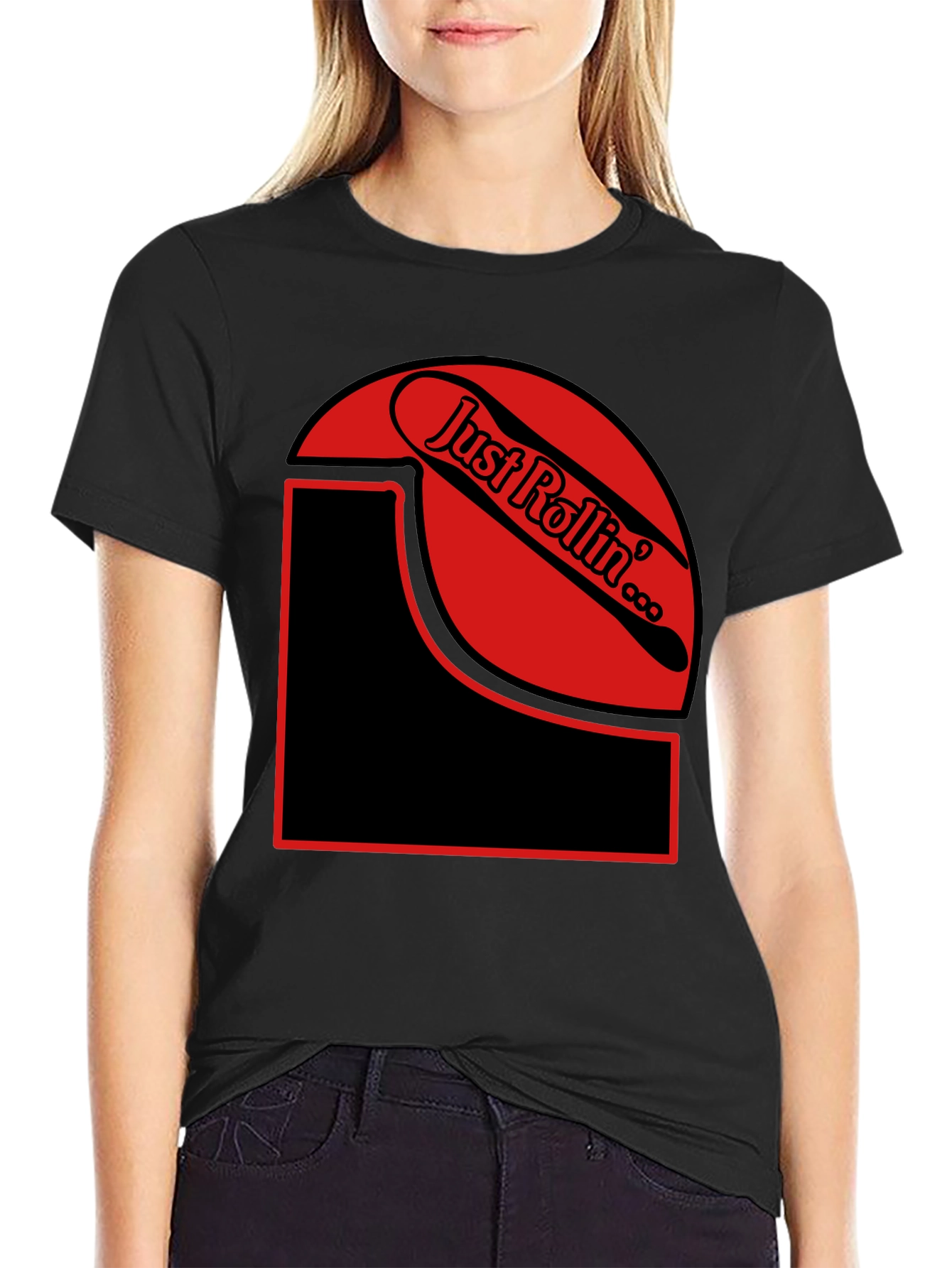 Rock this unique graphic tee featuring the words 'Just Rollin'.' The design features bold red accents against the black t-shirt, creating a striking visual. This tee is perfect for casual outings, skate sessions, or expressing your laid-back attitude. Crafted from a comfortable material, this shirt offers both style and ease. Make a statement and roll with confidence in this standout piece.