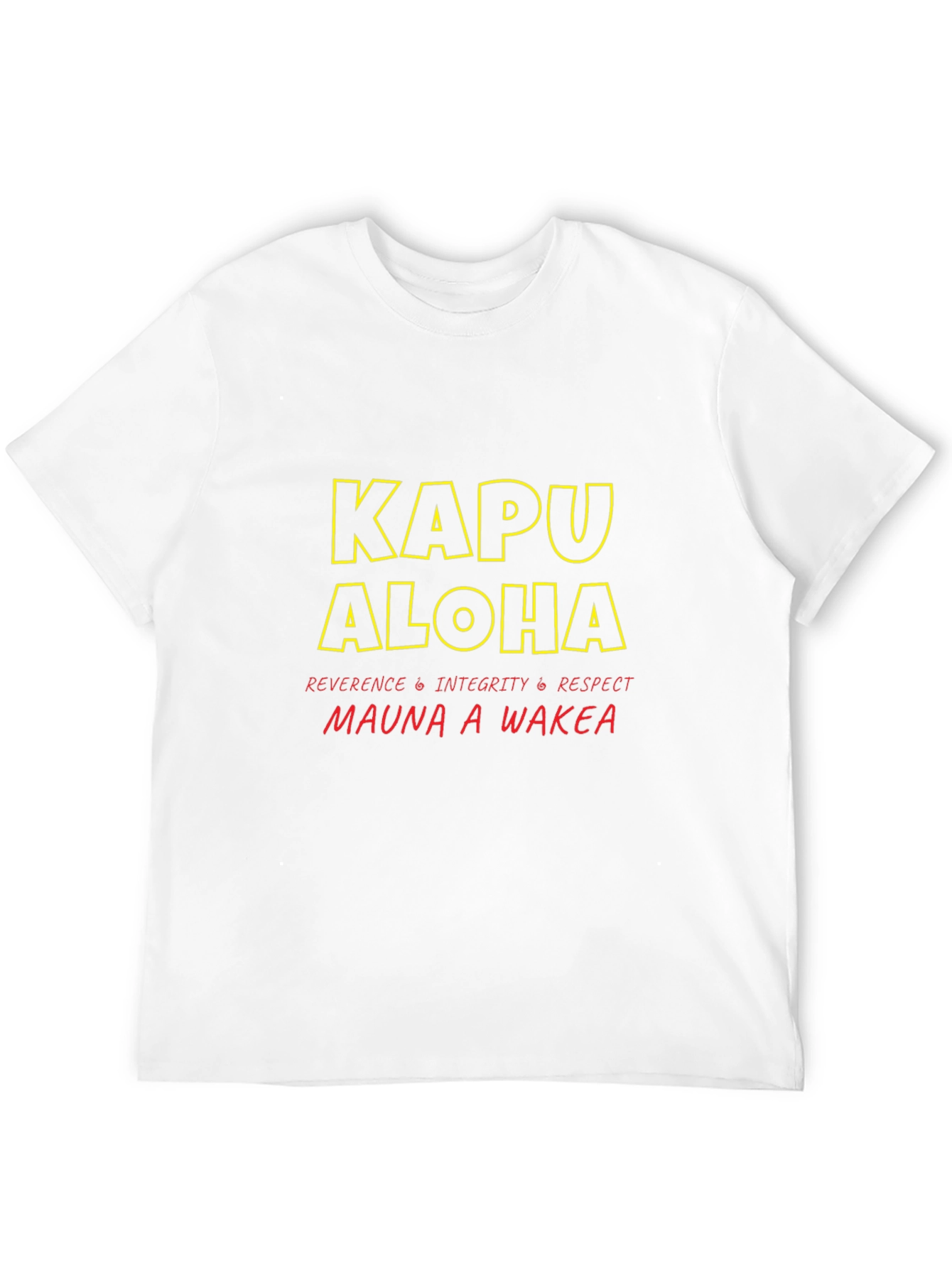 Show your values with this stylish Kapu Aloha t-shirt. Featuring the words 'Kapu Aloha' in a bold, yellow outline font, the tee also has 'Reverence, Integrity, Respect' and 'Mauna a Wakea' printed on the front. Made from a comfortable, dark-colored fabric, this shirt is perfect for everyday wear or special events. The meaningful message and eye-catching design make it a great conversation starter and a unique addition to your wardrobe. Wear it proudly and spread the spirit of Kapu Aloha wherever you go.
