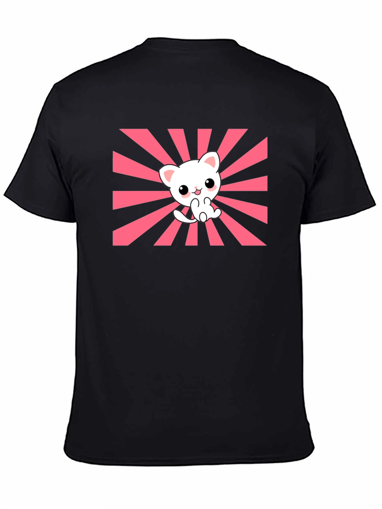 Show off your love for cats and Japanese culture with this unique t-shirt. This black t-shirt features a playful, cute white cat graphic sitting in front of a pink and black rising sun design. The bold graphic stands out, making this a statement piece that will get you noticed. Perfect for casual wear, expressing your unique style, or as a fun gift for cat lovers and anime fans. Made from comfortable materials for all-day wear. Add a touch of kawaii to your wardrobe today!