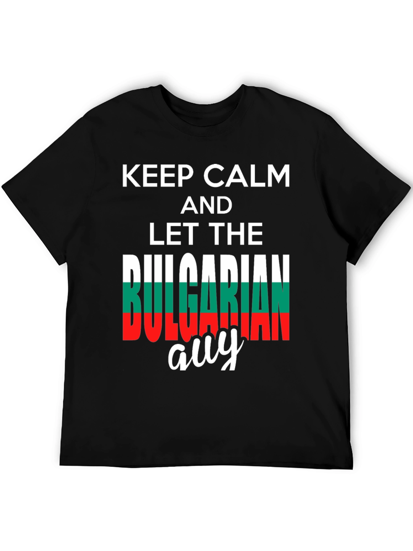 Show off your Bulgarian pride with this unique 'Keep Calm' themed t-shirt! The design features bold text in white with 'BULGARIAN' spelled out in the colors of the Bulgarian flag: green, white, and red. A stylish cursive font completes the phrase. Made from a soft, comfortable black fabric, this tee is perfect for casual wear. Whether you're celebrating your heritage or want a cool conversation starter, this Bulgarian-themed t-shirt is a great choice. Ideal for everyday wear, cultural events, or as a fun gift. Get yours today and let the Bulgarian guy handle it!