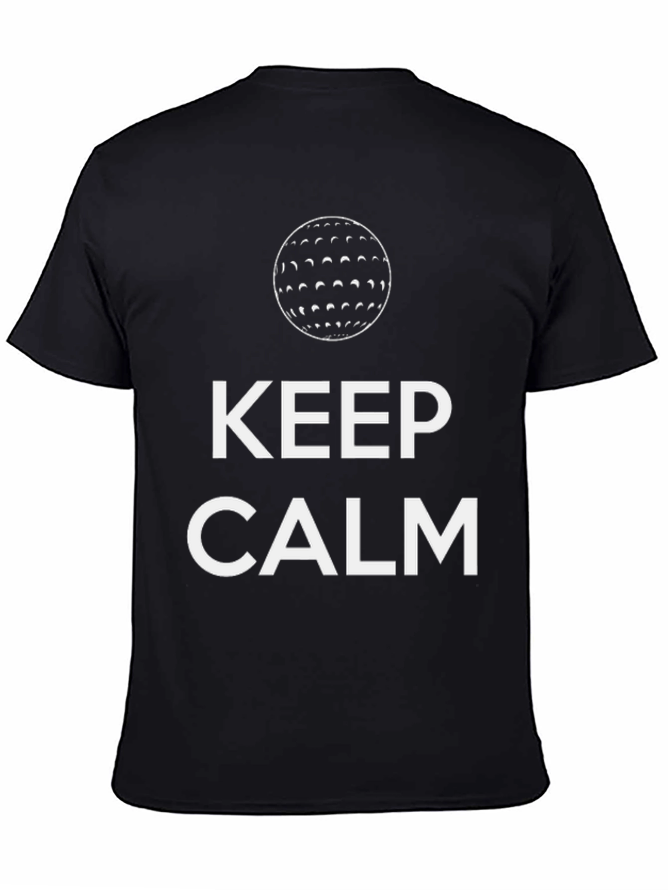 Stay cool on the course with this classic black t-shirt featuring a crisp white "Keep Calm" design and golf ball graphic. The shirt boasts a clean, minimalist aesthetic, perfect for golfers who appreciate a relaxed yet stylish look. Made from what appears to be soft, breathable fabric, this tee offers all-day comfort and unrestricted movement, whether you're hitting the links or just hanging out. Pair it with your favorite shorts or jeans for a casual, sporty vibe. A must-have for any golf enthusiast's wardrobe.