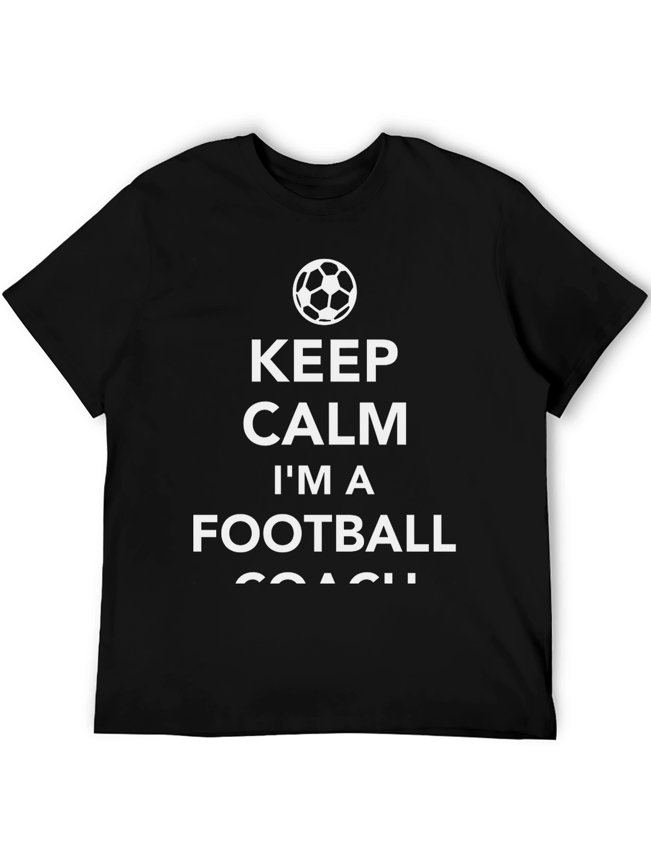Show your passion for football with this stylish black t-shirt. Featuring a classic crew neck and short sleeves, this comfortable shirt is made from soft, breathable fabric, perfect for everyday wear. The bold white graphic print includes a soccer ball icon and the phrase "KEEP CALM I'M A FOOTBALL COACH", making it a fun and expressive statement piece. Ideal for coaches, players, or any football enthusiast, this t-shirt is great for training sessions, casual outings, or showing team spirit. Let everyone know you're a proud football coach!