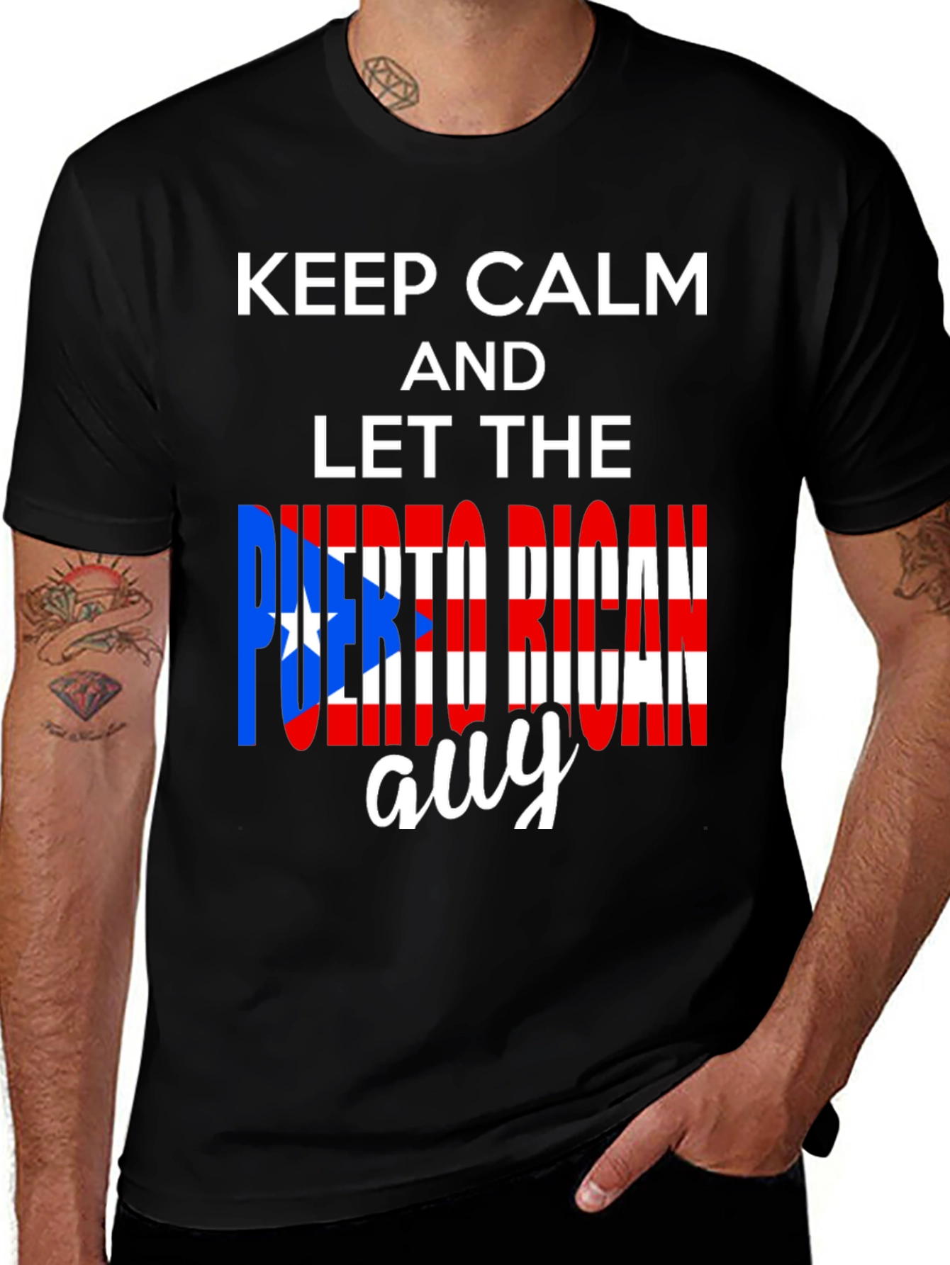 Show your Puerto Rican pride with this cool t-shirt. The shirt features the phrase "Keep Calm and Let the Puerto Rican Guy..." with the word "Puerto Rican" colored in the style of the Puerto Rican flag. The shirt is black and appears to be made from a soft and comfortable fabric. It's perfect for casual wear, parties, or showing off your heritage. Get yours today!