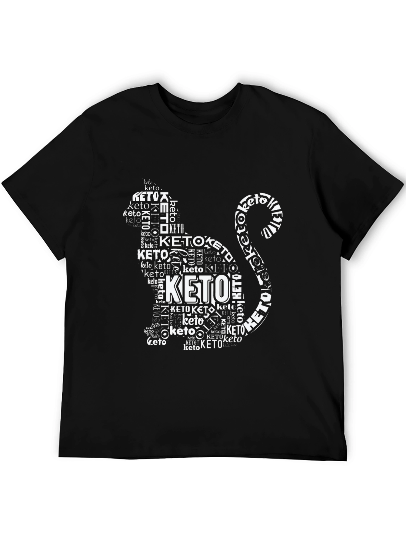 Embrace the Keto lifestyle with this unique black t-shirt. The design features a stylized cat silhouette creatively filled with the word 'Keto' in various fonts and sizes. This shirt is perfect for anyone passionate about the ketogenic diet, whether you're a seasoned pro or just starting out. Made from a comfortable and durable fabric, it's ideal for everyday wear, workouts, or casual outings. Show off your commitment to health and wellness with this eye-catching and conversation-starting tee. Let everyone know you are on the Keto journey!