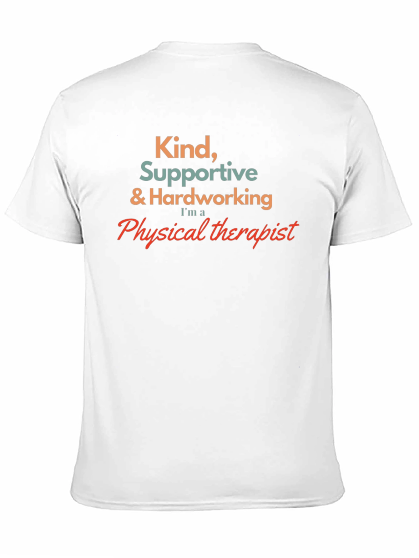 Show your support for physical therapists with this stylish black t-shirt. The shirt features the words "Kind, Supportive & Hardworking" in teal and orange lettering, above the phrase "I'm a Physical Therapist" in reddish-orange. It's made of a soft, comfortable fabric, perfect for everyday wear. This t-shirt is ideal for physical therapists or anyone who wants to show appreciation for healthcare professionals. Wear it to work, to the gym, or out and about. It makes a thoughtful gift for a physical therapist, too.