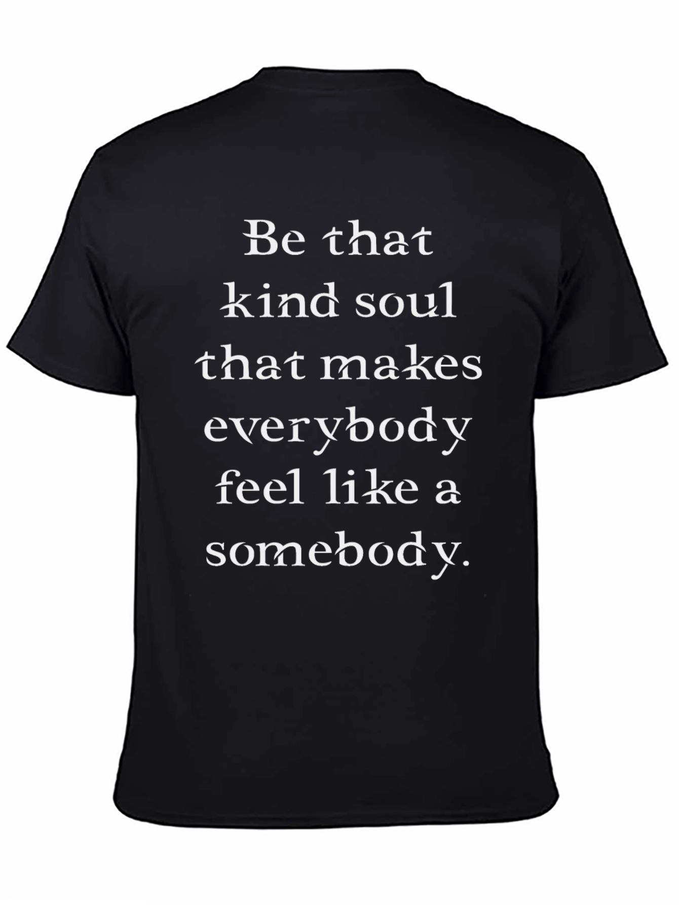 Spread positivity with this black graphic tee. Featuring the message "Be that kind soul that makes everybody feel like a somebody" in a clear, white font. This tee is a comfortable and stylish way to inspire those around you. Made with soft fabric, this tee is perfect for casual wear, motivational events, or simply adding a positive vibe to your everyday look. Its unique design makes it a great conversation starter and a reminder to spread kindness wherever you go. Wear your heart on your sleeve, or rather, on your chest, with this inspirational tee.