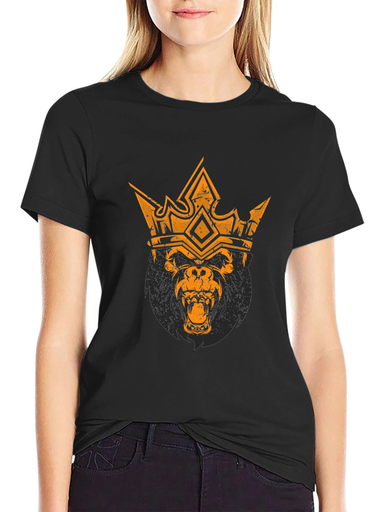 Show off your fierce side with this bold King Kong graphic t-shirt. This black tee features a striking design of a roaring gorilla wearing a regal crown, rendered in a distressed, vintage style. The eye-catching print adds an edgy touch to the classic crew neck silhouette. Made from a comfortable, breathable fabric, this t-shirt is perfect for everyday wear. Pair it with jeans for a casual look, or dress it up with a jacket for a night out. Ideal for anyone who loves unique, statement-making apparel, this King Kong tee is sure to turn heads and spark conversations. A must-have addition to any wardrobe!