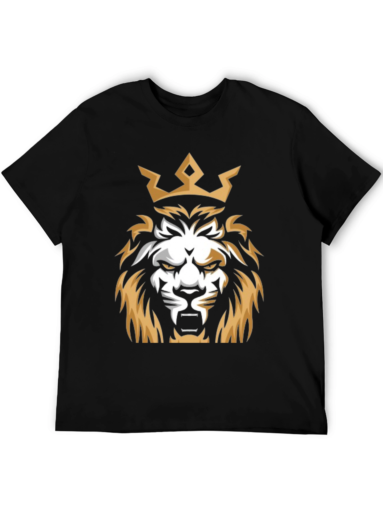 Dominate your style with this striking black t-shirt featuring a bold graphic of a crowned lion. The design showcases a majestic lion's head, complete with a golden crown, rendered in a dynamic, eye-catching style. This tee is made from what appears to be soft, breathable cotton, ensuring all-day comfort. The classic black color makes it incredibly versatile, pairing effortlessly with jeans, shorts, or joggers for a casual yet confident look. Ideal for everyday wear, concerts, or casual hangouts, this t-shirt is a statement piece that speaks volumes about your fearless attitude.